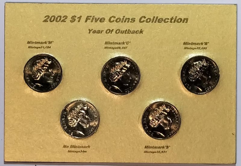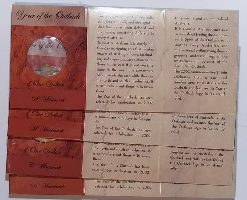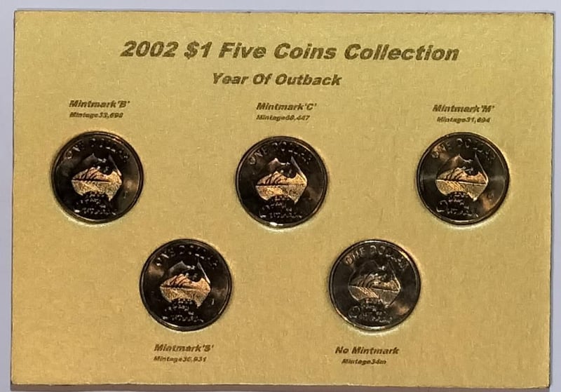 2002 FIVE $1 COINS COLLECTION YEAR OF OUTBACK BCMS & NO MINTMARK Ex Mint Folder Condition: UNC488325+3