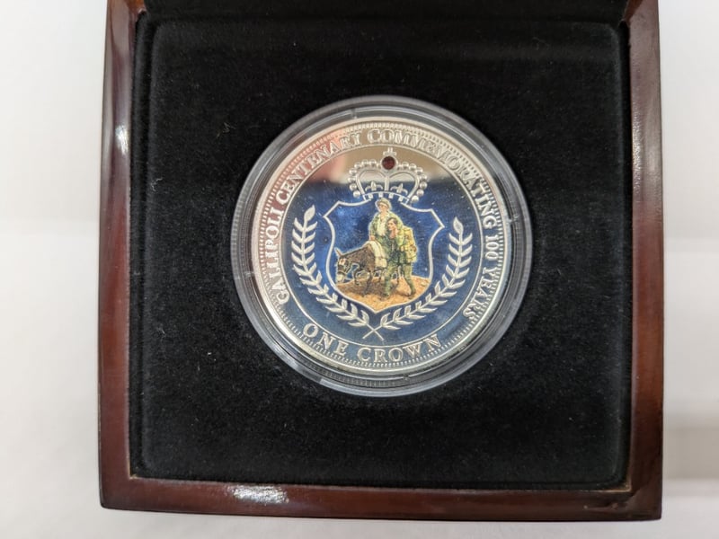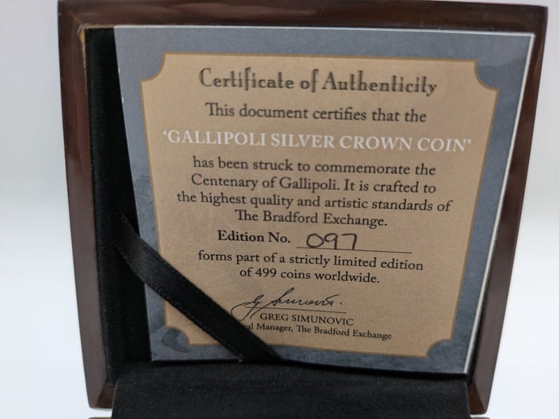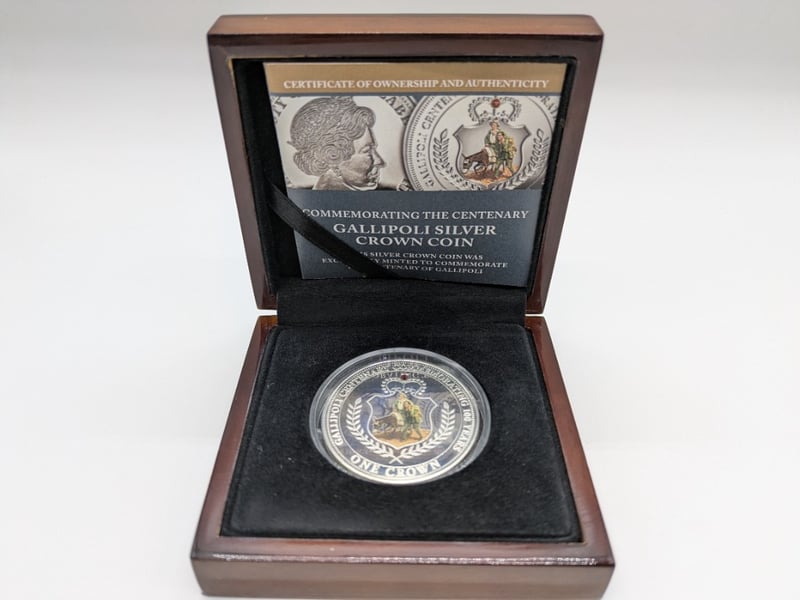 GALLIPOLI SILVER CROWN COIN- COMMEMORATING THE CENTENARYCertificate Of Authenticity: 097Year: 2015Alloy: 925 SilverInlaid: Swarovski Ruby CrystalWeight: 28.28GDiameter: 38.60MmEdition Limit: 499 SetsQuality: Proof, The Highest Quality, Struck Especially For CollectorsCondition: GoodWINNELLIE153866+3