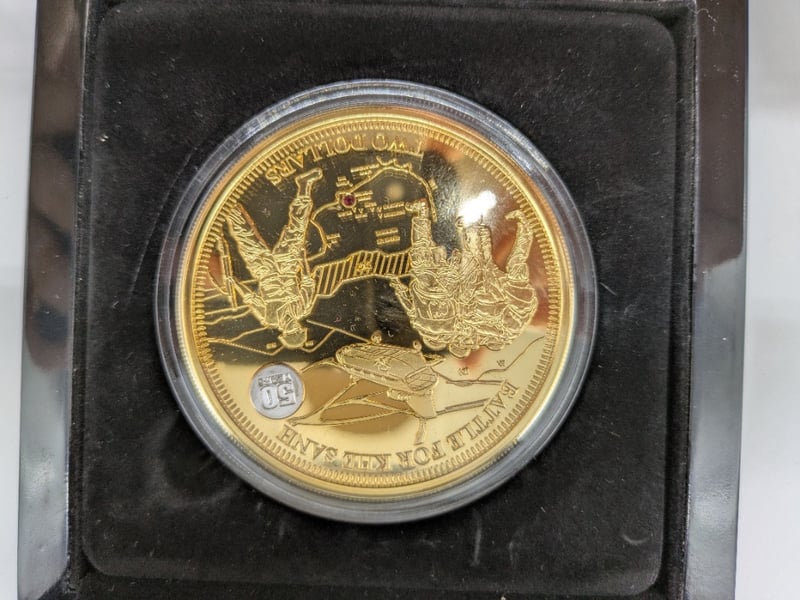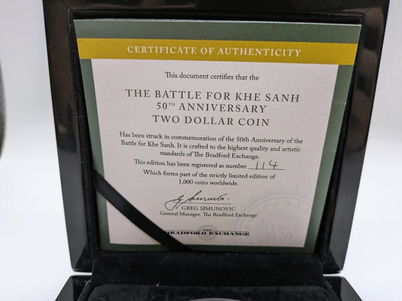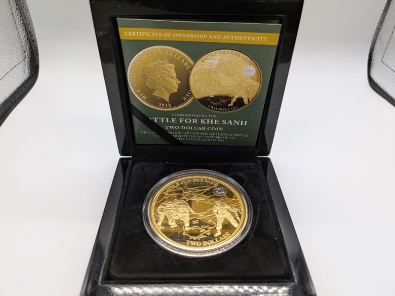 BATTLE FOR KHE SANH TWO DOLLAR COINCertificate Of Authenticity: 114Alloy: Layered 24Ct Gold With Rhodium-Platinum Accent + A Single Red Swarovski Crystal Coin: Battle For Khe Sanh Two DollarDiameter: 65MmWeight: 110GCondition: GoodWINNELLIE153866+4