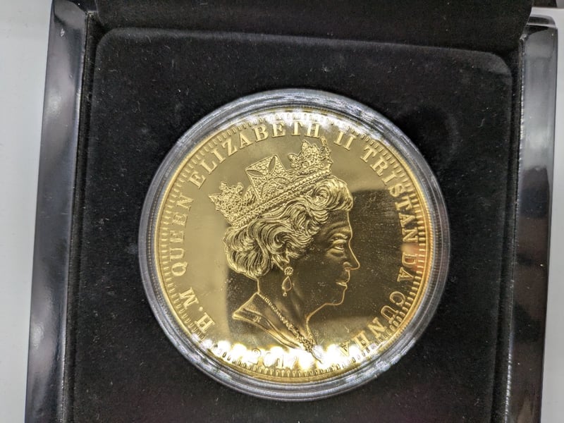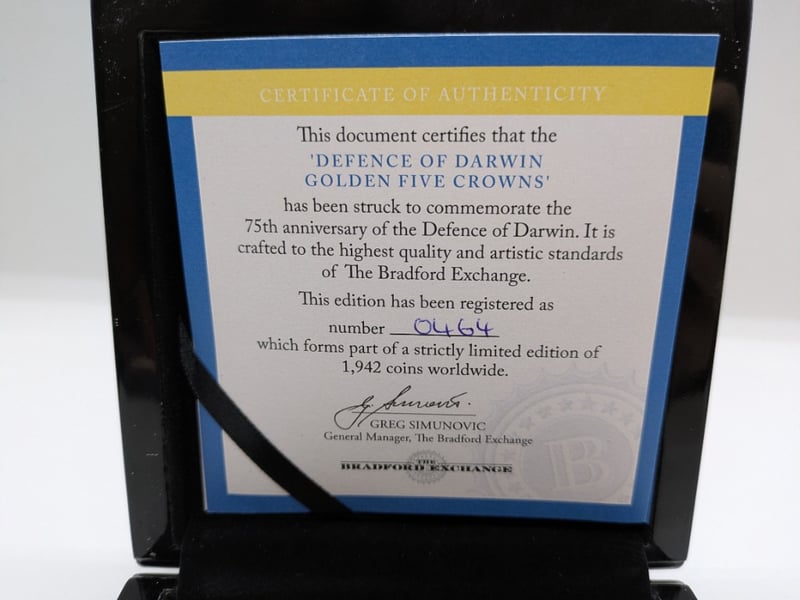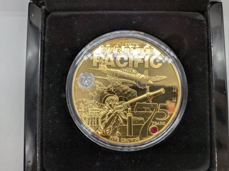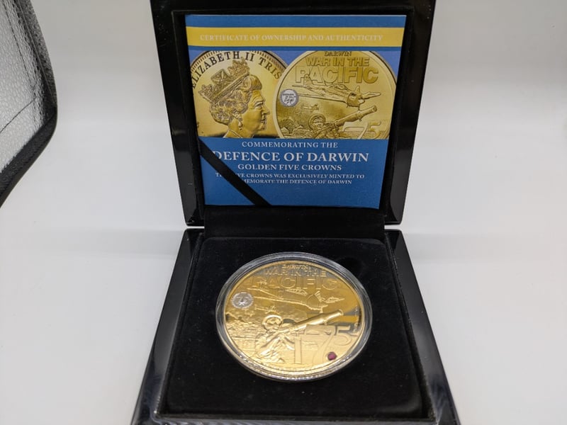DEFENCE OF DARWIN GOLDEN FIVE CROWNSCertificate Of Authenticity: 0464Year: 2017Alloy: Layered 24Ct Gold, 75Th Anniversary Privy Mark In Rhodium AccentingDiameter: 65MmWeight: 110GmsInlaid: Swarovski Ruby CrystalCondition: GoodWINNELLIE153866+5