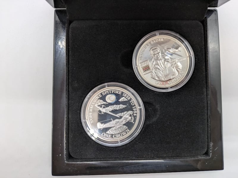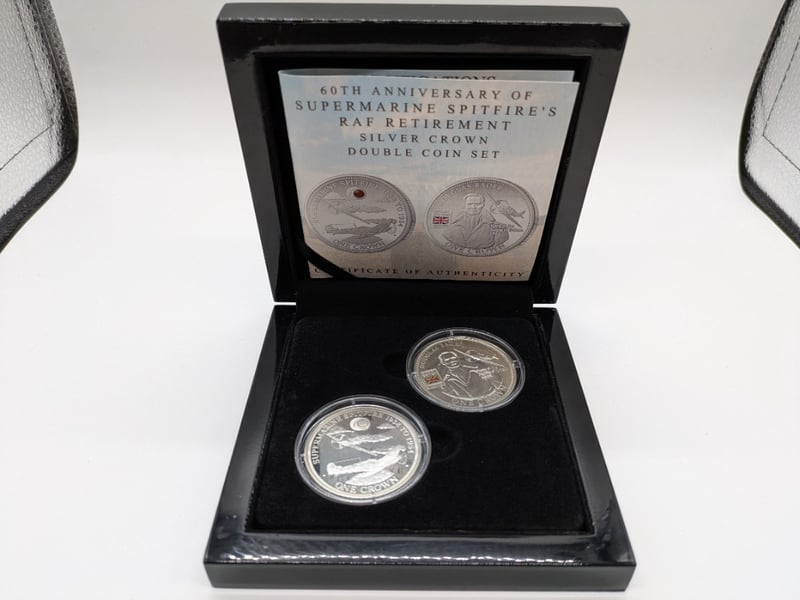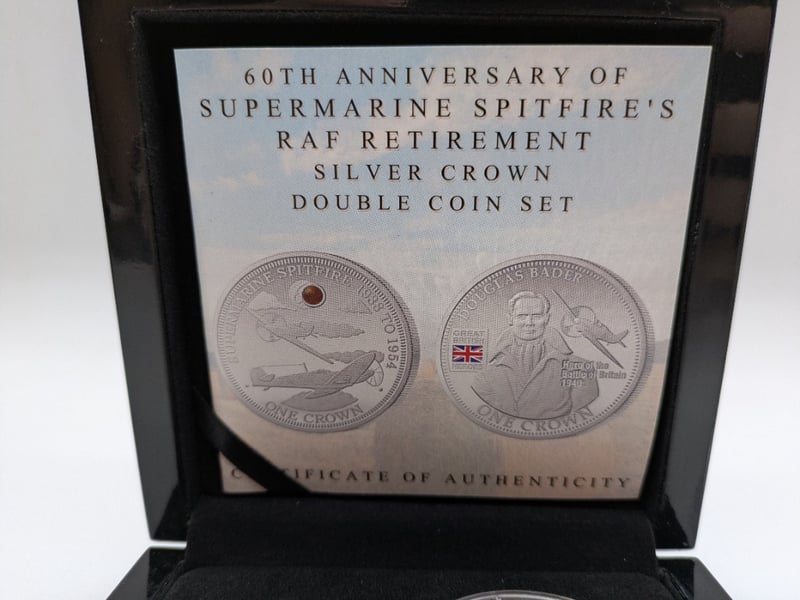 60TH ANNIVERSARY OF SUPERMARINE SPITFIRE'S RAF RETIREMENT SILVER CROWN DOUBLE COIN SETCertificate Of Authenticity Denomination: One CrownMetal: Sterling SilverDiameter: 38.6MmWeight: 28.28GMintage: 1954Condition: GoodWINNELLIE153866+9