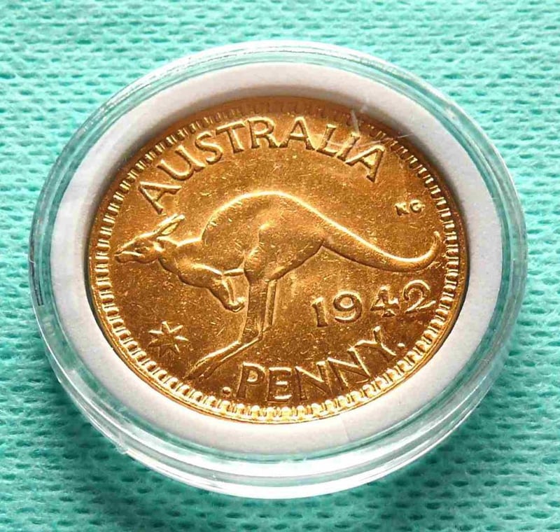 1942 KGVI UNCIRCULATED 18CT. GOLD PLATED AUSTRALIAN PENNY IN PROTECTIVE CLEAR CAPSULE. 488345+11