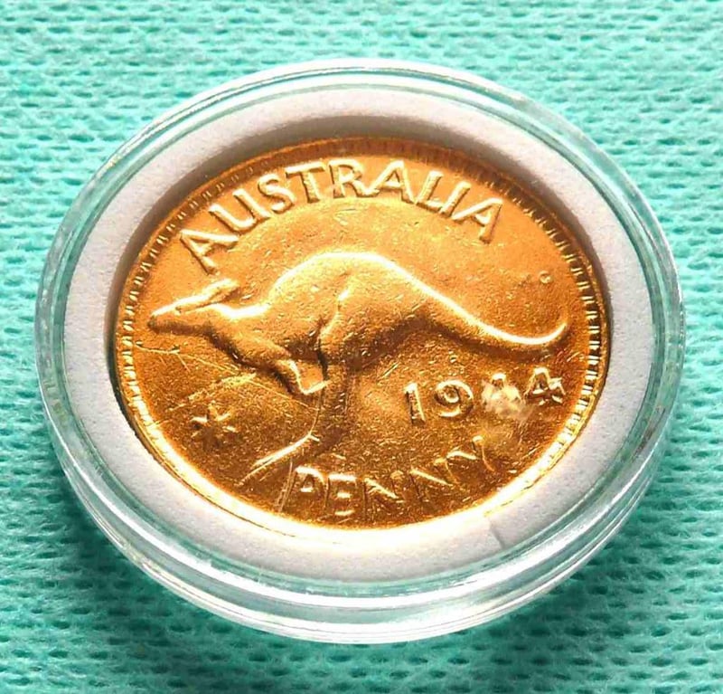 1944 KGVI UNCIRCULATED 18CT. GOLD PLATED AUSTRALIAN PENNY IN PROTECTIVE CLEAR CAPSULE. 488345+13