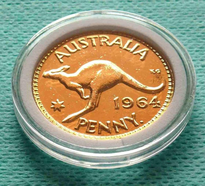1964 QEII UNCIRCULATED 18CT. GOLD PLATED AUSTRALIAN PENNY IN PROTECTIVE CLEAR CAPSULE. 488345+15
