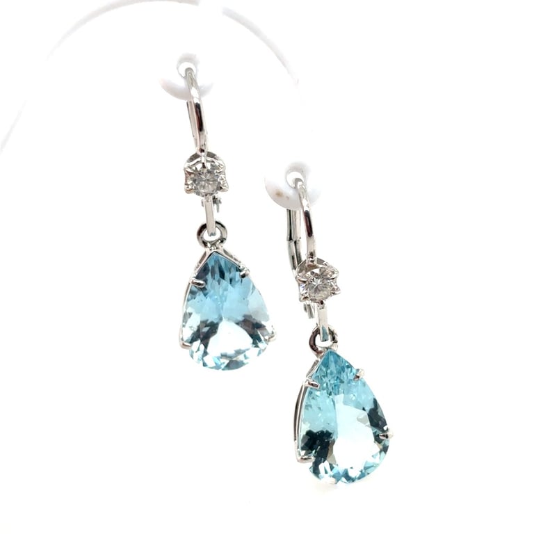 Featuring 2 Pear Cut Aquamarines, Claw Set, 9.28Ct In Total Combined Weight (15.0 X 10.2 X 5.8 Mm And 15.0 X 10.0 X 6.0 Mm), And Blue In Colour. Round Brilliant Cut Diamonds, Claw Set, 0.62Ct In Total Combined Weight (4Mm), Vs/Si In Clarity And G In Colour. Earrings Are 6.05 Grams In Weight.