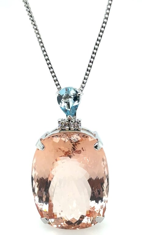 New Piece Featuring An Oval Cut Morganite, Claw Set, 53.78 Grams In Weight (28.4 X 21.4 X 13.5 Mm), And Orangey Pink In Colour. A Pear Cut Aquamarine, Claw Set, 1.00Ct In Weight (8.4 X 6.1 Mm), And Light Blue In Colour. 2 Round Brilliant Cut Diamonds, Claw Set, 0.10Ct In Total Combined Weight, Vs In Clarity And F In Colour Pendant Is On An 18Ct White Gold Chain