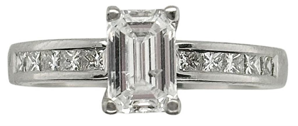 This 18Ct White Gold Diamond Ring Features 1X Emerald Cut Centre Diamond, Claw Set 1.02Ct In Weight Measuring: 7.0Mm X4.6Mm, Si In Clarity And E In Colour. The Ring Also Features 10X Princess Cut Diamonds, Channel Set In Shoulders Of The Ring, 0.35Ct In Total Combined Weight, Vs In Clarity And F In Colour.