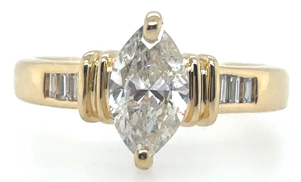 18CT YELLOW GOLD AND DIAMOND RING Total Item Weight: 4.79gms This 18Ct Yellow Gold Ring Features 1 X 1.01Ct Marquise Cut Claw Set Diamond Measuring 5.52Mm X 10.1Mm, Is P1 In Clarity And G In Colour With 6 X Baguette Cut Diamonds Set In The Shoulders Of The Ring, 0.15Ct In Total Combined Weight, Vs In Clarity And G In Colour. Ring Size: N. Jewellery Valuations Provided By A Third Party Professional Not Directly Associated With Lloyds Auctions at AUD $13750This Insurance Valuation has been provided by a registered Jewellery Valuer and is intended for insurance purposes only. The valuation amount has no bearing on the auction value of the item. Any questions regarding the valuation should be directed to the issuing Valuer (refer to contact details on the certificate) as Lloyds have no association or relationship with the Valuer or the valuation amount contained within the valuation. Condition: Excellent- Refer Images 0162901+187CROSSDOCK