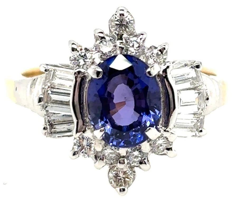 18CT TWO TONE GOLD SAPPHIRE AND DIAMOND RING Total Item Weight: 5.94gms This 18Ct Yellow & White Gold Ring Features 1 X 1.48Ct Oval Cut Claw Set Unheated Madagascan Sapphire, Measuring 7.67Mm X 6.03Mm X 3.74Mm And Is Blue To Purple In Colour As Per Aig Report Number: Gem2021122854872 With 6 X Baguette & 10 X Round Brilliant Cut Diamonds, 0.55Ct In Total Combined Weight, Vs In Clarity And F In Colour. Jewellery Valuations Provided By A Third Party Professional Not Directly Associated With Lloyds Auctions at AUD $20950This Insurance Valuation has been provided by a registered Jewellery Valuer and is intended for insurance purposes only. The valuation amount has no bearing on the auction value of the item. Any questions regarding the valuation should be directed to the issuing Valuer (refer to contact details on the certificate) as Lloyds have no association or relationship with the Valuer or the valuation amount contained within the valuation. Condition: Excellent- Refer Images 0162901+157CROSSDOCK
