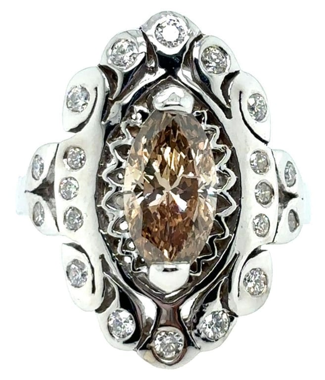 This 18K White Gold Ring Features 1 X 1.55Ct Marquise Cut Claw Set Diamond, Si In Clarity And Fancy Light Brown In Colour With 20 X Round Brilliant Cut Diamonds, 0.68Ct In Total Combined Weight, Vs In Clarity And F In Colour.