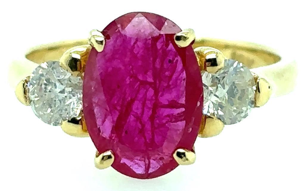 This 18Ct Yellow Gold Ring Features 1 X 1.56Ct Natural Mozambique Ruby, Measuring 10.2Mm X 7.3Mm X 1.8Mm And Pinkish Red In Colour With 2 X Round Brilliant Cut Diamonds Set In The Shoulders Of The Ring, 0.72Ct In Combined Weight, P1 In Clarity And G In Colour.