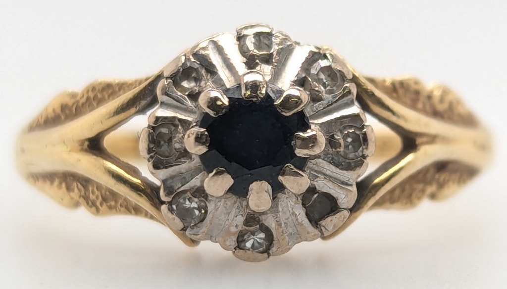 18K YELLOW/WHITE GOLD SPINEL AND DIAMOND RING Ring Features Round Cut Black Spinel In Centre Eight Claw Setting, Seven Round Cut Diamonds Set Around Centre Total Item Weight: 3.93g Markings: Stamped: 750 Condition: Good - Refer To Images 584944+2