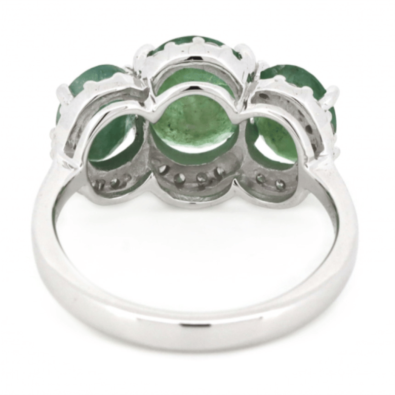 14K WHITE GOLD, EMERALD AND DIAMOND, HALO TRILOGY RING. THE CENTRE FEATURES, 3 OVAL CUT, MEDIUM LIGHT BLUISH-GREEN, EMERALDS (2.93CT TSW, EYE VISIBLE INCLUSIONS), CLAW SET. ENCOMPASSING THE STONES ARE, 26 ROUND BRILLIANT CUT, DIAMONDS (0.27CT TDW, H-J COLOUR, SI2-I2 CLARITY), MICRO-CLAW SET. RING SIZE L. THE EMERALDS HAVE SOME NATURAL INCLUSIONS THAT HAVE REACHED THE SURFACE. Valuations Provided by an Independent Third-Party Professional Not Directly Associated With Lloyds Auctions at AUD $11120This valuation has been conducted by an independent third-party professional. The valuation amount is an assessment by the issuing valuer and does not reflect the auction value of the item. Any inquiries regarding the valuation should be directed to the issuing valuer (refer to contact details on the certificate), as Lloyds Auctions has no affiliation or influence over the valuation, the valuer, or the stated amount. Condition: Good - Refer Images 0645864+1390