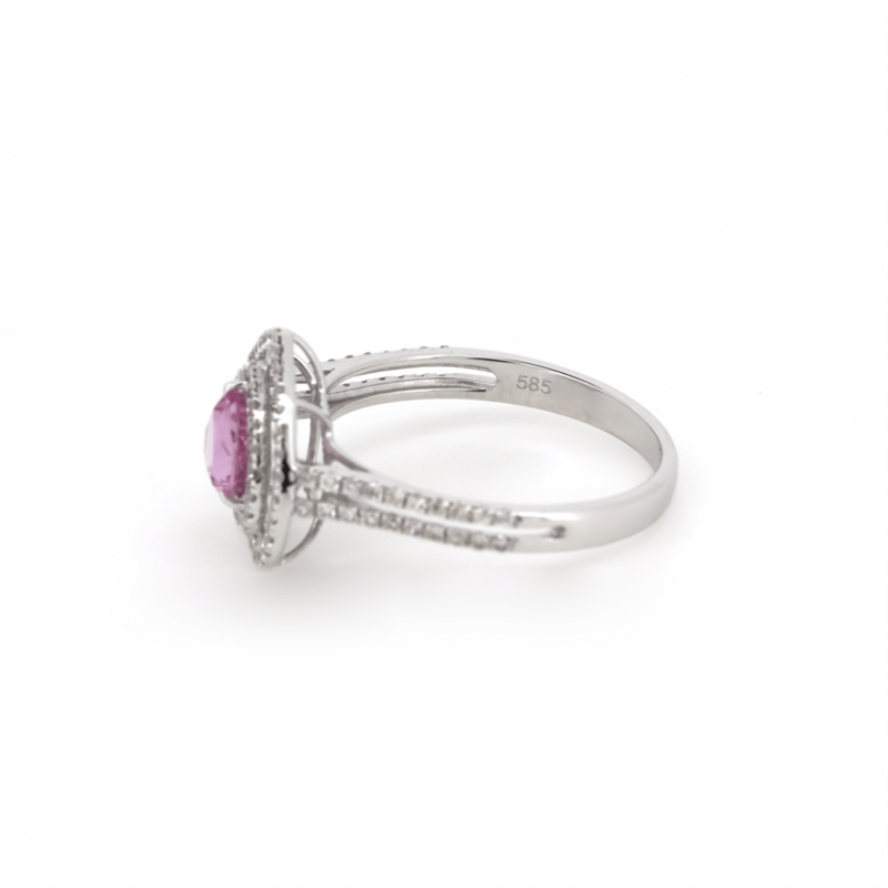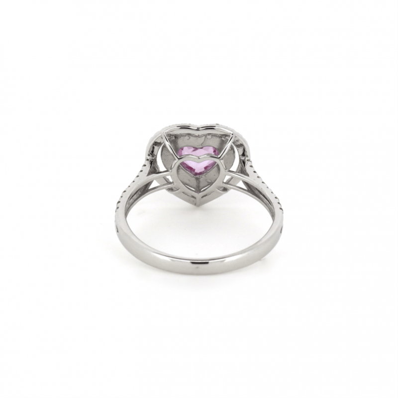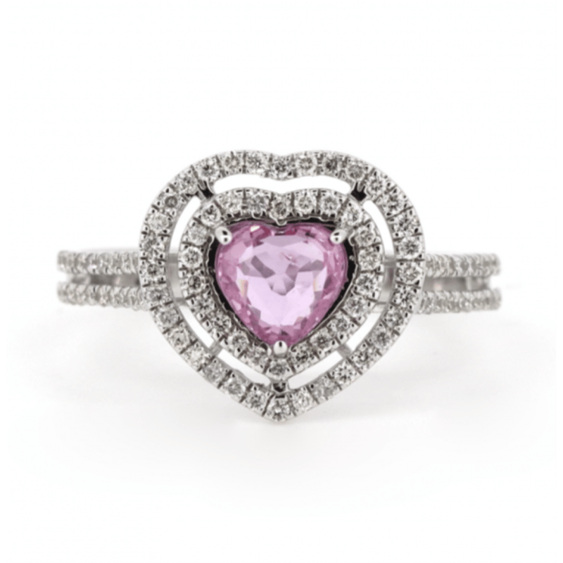 14K WHITE GOLD, PINK SAPPHIRE AND DIAMOND, HALO HEART RING. THE CENTRE FEATURES, ONE HEART CUT, MEDIUM REDDISH-PINK, SAPPHIRE (0.81CT, MINOR EYE VISIBLE INCLUSIONS), CLAW SET. SURROUNDING THE CENTRE IN A DOUBLE HALO AND DECORATING THE BAND ARE, 94 ROUND BRILLIANT CUT, DIAMONDS (0.35CT TDW, J-K COLOUR, SI2-I2 CLARITY), MICRO-CLAW SET. RING SIZE M 1/2. Valuations Provided by an Independent Third-Party Professional Not Directly Associated With Lloyds Auctions at AUD $6890This valuation has been conducted by an independent third-party professional. The valuation amount is an assessment by the issuing valuer and does not reflect the auction value of the item. Any inquiries regarding the valuation should be directed to the issuing valuer (refer to contact details on the certificate), as Lloyds Auctions has no affiliation or influence over the valuation, the valuer, or the stated amount. Condition: Good - Refer Images 0645864+1365
