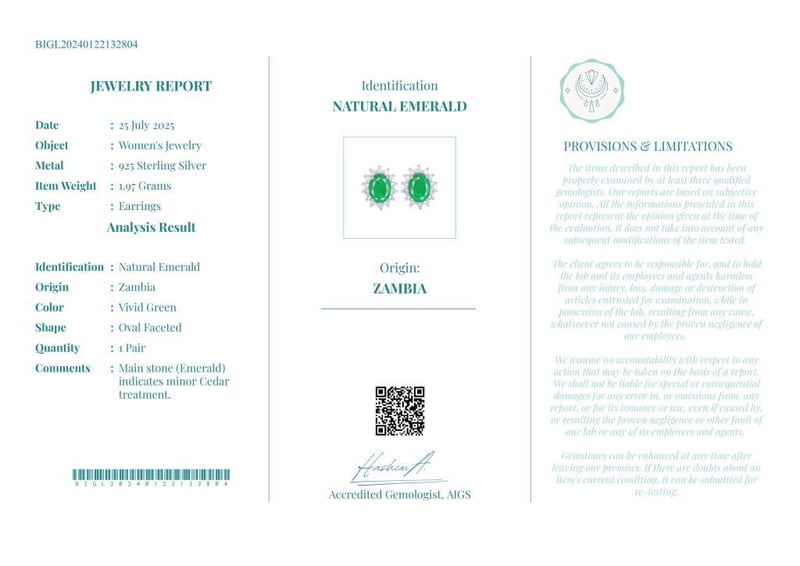 Comments : Main Stone (Emerald) Indicates Minor Cedar Treatment.