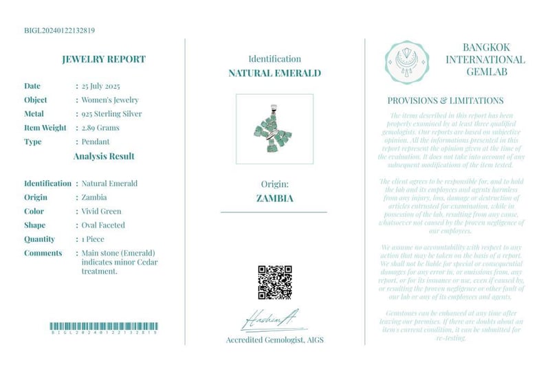Comments : Main Stone (Emerald) Indicates Minor Cedar Treatment.