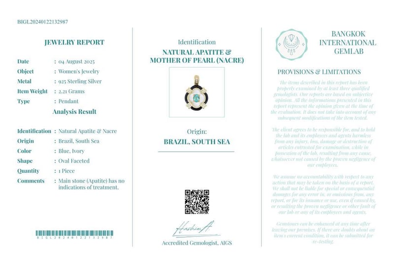 NATURAL APATITE & MOTHER OF PEARL (NACRE) PENDANT ON 925 SILVER - WITH DIGITAL CERTIFICATE ONLY Gemstone : Natural Apatite & Mother Of Pearl (Nacre)Certificate (Digital): Bigl20240122132987Item Total Weight : 2.21 GramsMain Stone Color : Blue, IvorySize : Comments : Main Stone (Apatite) Has No Indications Of Treatment.✻ Verify Report Online At Www.Bangkokinternationalgemlab.Co Condition: Good - Refer Images 0161135+35