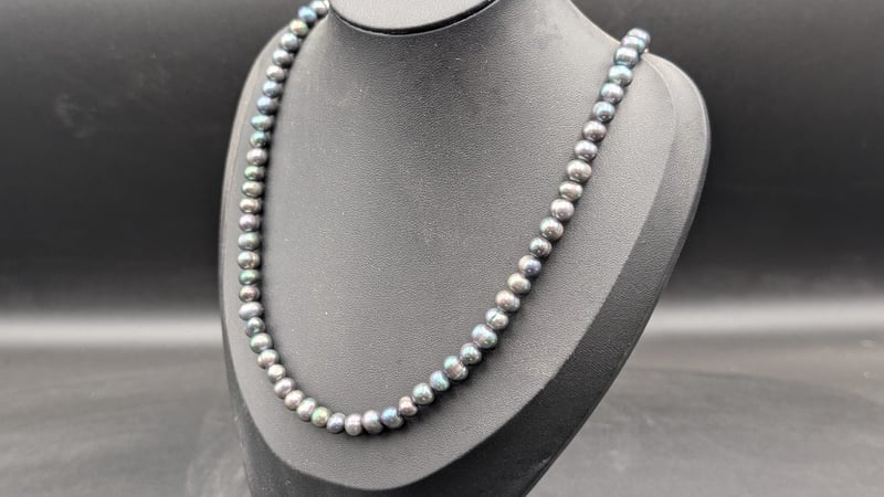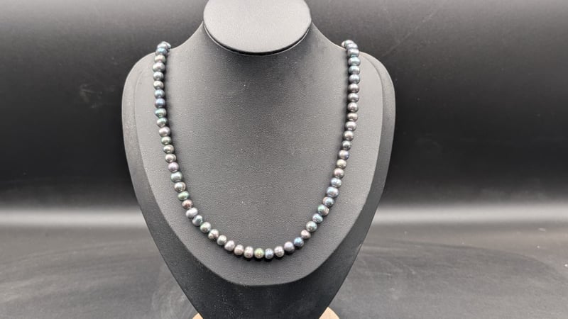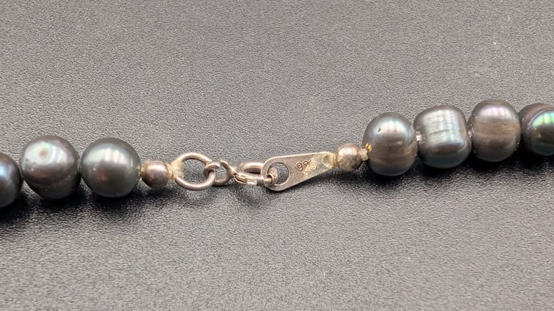 An Elegant Freshwater Pearl Necklace Featuring A Continuous Strand Of Grey-Black Pearls With Subtle Iridescent Overtones Characteristic Of Freshwater Cultured Pearls. The Pearls Are Uniformly Graduated And Knotted Between Silver Spacers For Security And Movement. The Piece Is Completed With A Sterling Silver Lobster Clasp And Exhibits The Hallmark Indicating Genuine 925 Silver Composition. Suitable For Both Formal And Casual Wear, This Classic Strand Offers Timeless Appeal And Represents Quality