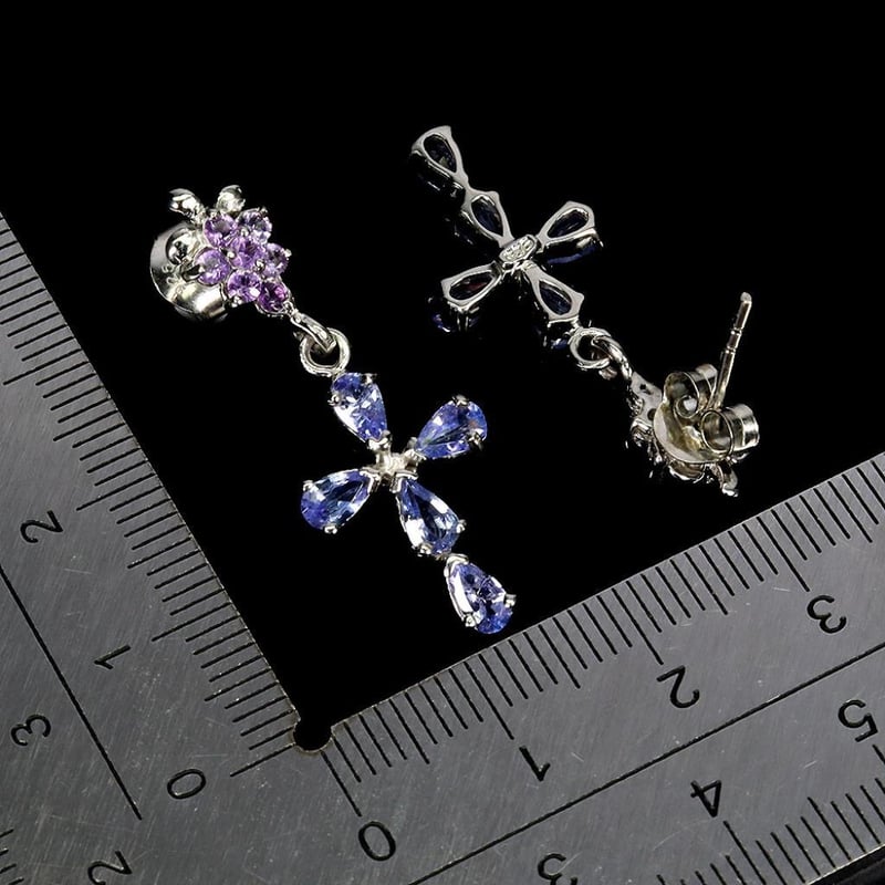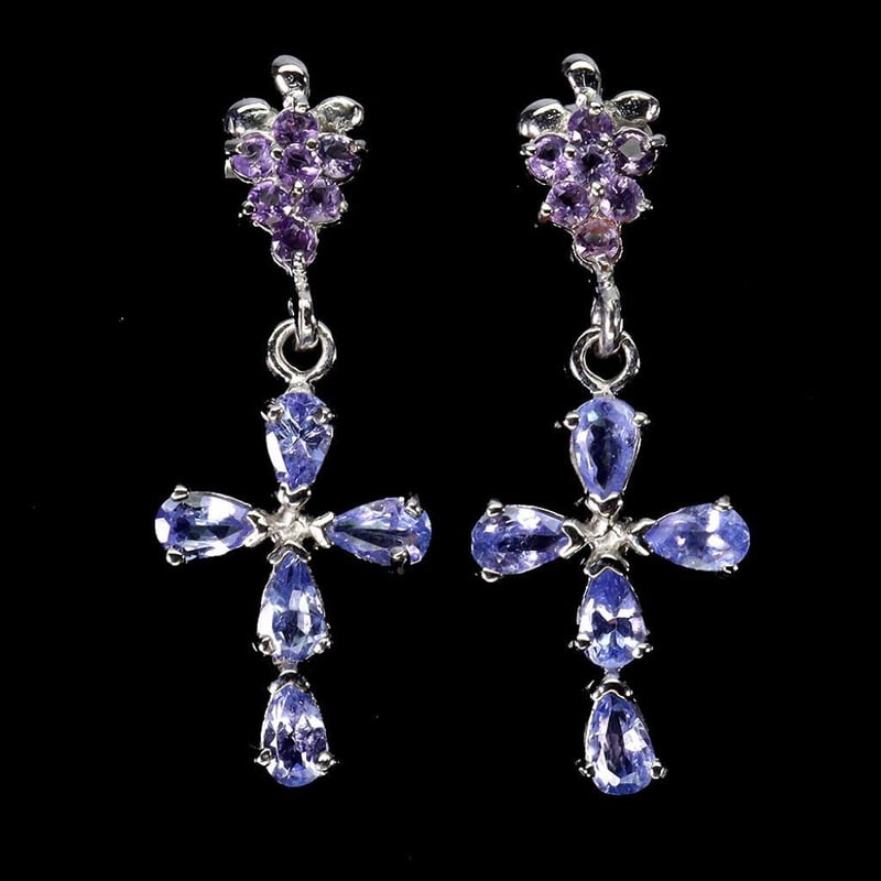 Natural Tanzanite & Amethyst Cross Earrings. Made In Solid Sterlong Silver And Plated In14K White Gold. Features Natural Violetish Blue Tanzanites And Natural Purple Amethyts. Earrings Measure 32.0 X 12.0 Mm.
