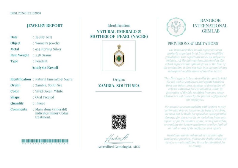 NATURAL ZAMBIAN EMERALD & MOTHER OF PEARL PENDANT ON 925 SILVER - WITH DIGITAL CERTIFICATE ONLY Gemstone : Natural Zambian Emerald & Mother Of PearlCertificate (Digital): Bigl20240122132868Item Total Weight : 2.78 GramsMain Stone Color : Vivid Green, WhiteSize : Comments : Main Stone (Emerald) Indicates Minor Cedar Treatment.✻ Verify Report Online At Www.Bangkokinternationalgemlab.Co Condition: Good - Refer Images 01611139+27