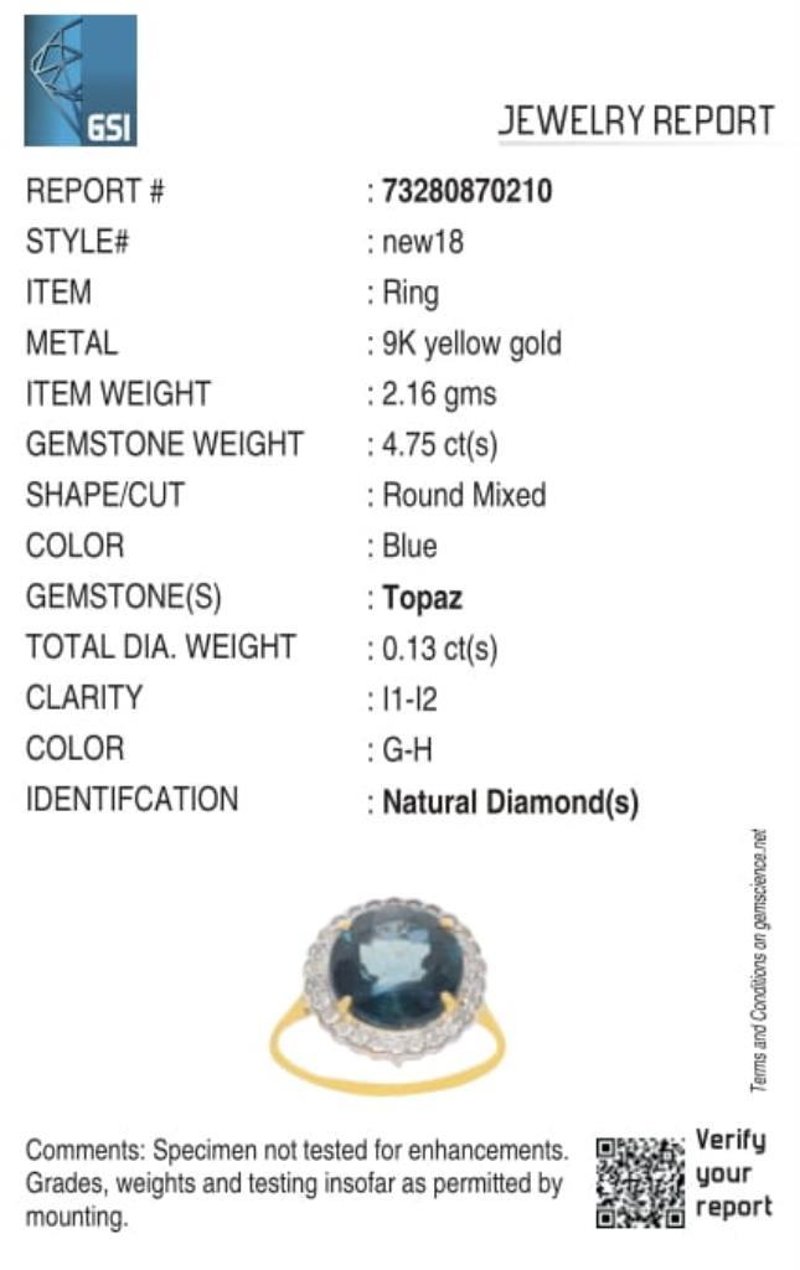 9CT YELLOW GOLD NATURAL LONDON BLUE TOPAZ & DIAMOND RING Weight Of The Item: 2.16 GFineness Of Metal(S): Yellow Gold 9KtThe Ring Consists Of (1) Round Brilliant Natural London Blue Topaz. Surrounding The Main Stones Are Round Brilliant Cut Natural Diamonds.Identification: Natural London Blue TopazColor: BlueShape: Round Brilliant CutNo. Of Stone: 1Dimension: 10 Mm X 10 Mm X 6 MmWeight: 4.75 CaratsCut: Very GoodIdentification: Natural DiamondShape: Round Brilliant CutWeight: 0.13 CtsCut: Excellent.Certificates Are Provided By Gemological Science International (Gsi), An Independent Third-Party Gemological Laboratory Based In The Usa And Recognised Among The Top 10 Gem Labs Globally Markings: 9ct Condition: Good - Refer Images 0488218+17