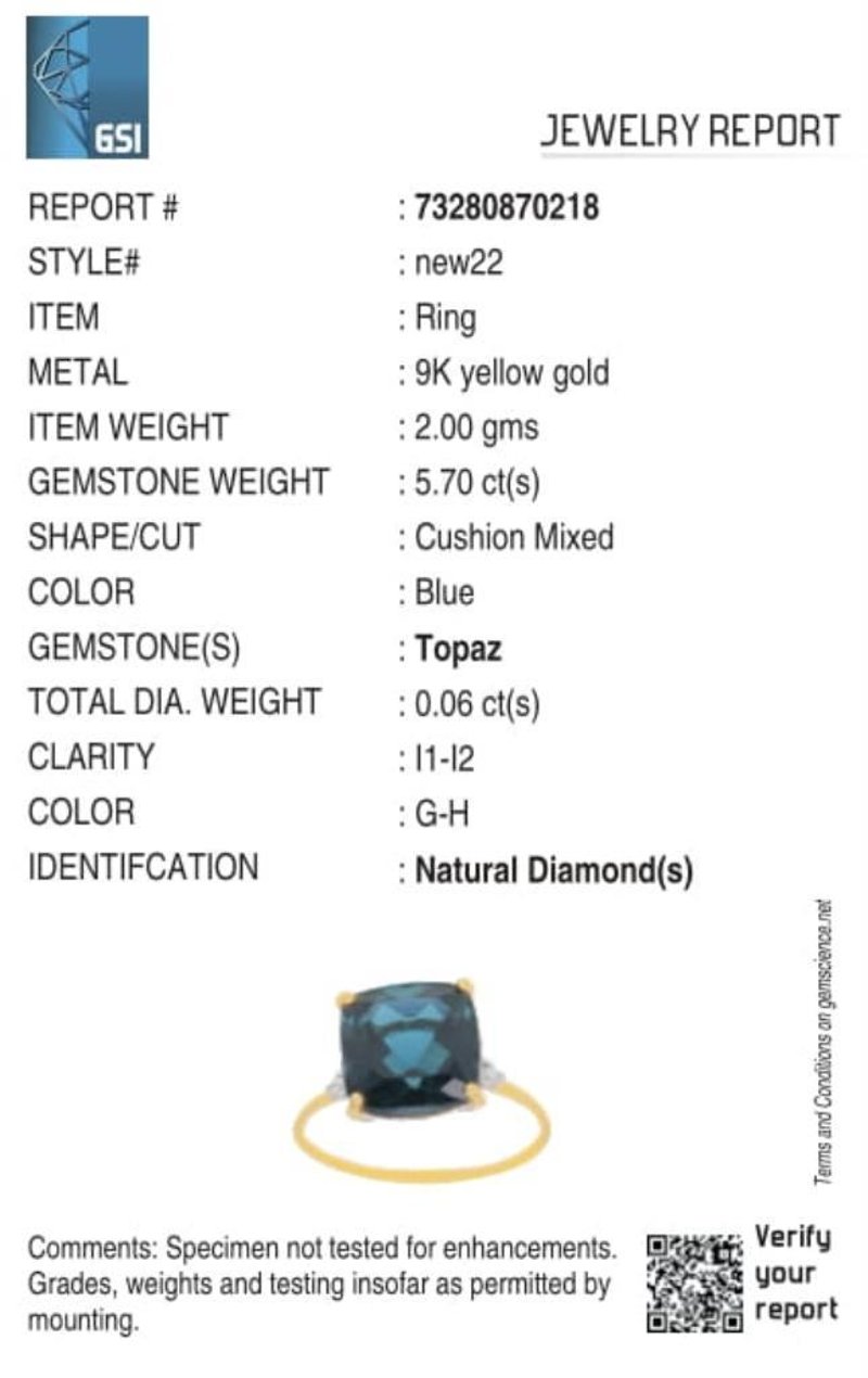 The Ring Consists Of (1) Cushion Brilliant Natural London Blue Topaz. Surrounding The Main Stones Are Round Brilliant Cut Natural Diamonds.