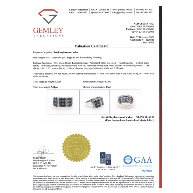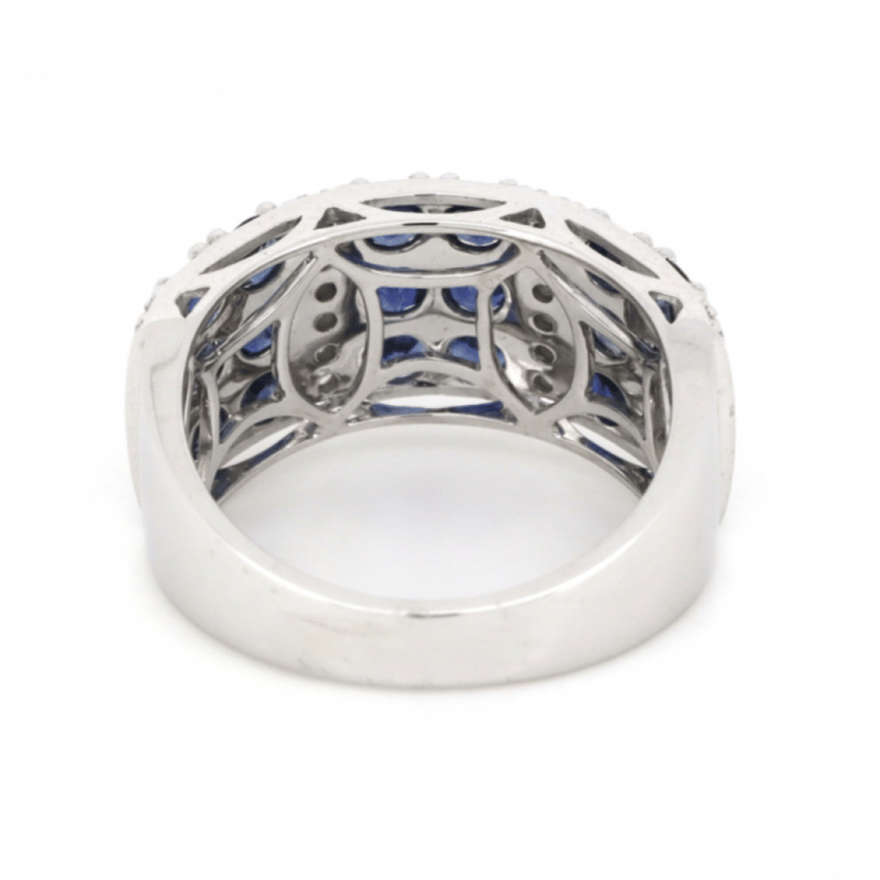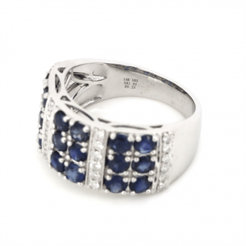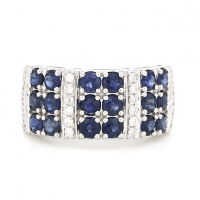 14K WHITE GOLD, BLUE SAPPHIRE AND DIAMOND, DECORATIVE BAND RING. THE CENTRE FEATURES, 18 ROUND CUT, MEDIUM DARK ROYAL BLUE, SAPPHIRES (1.92CT TSW, EYE CLEAN CLARITY), 4 CLAW SET. ACCOMPANYING THE CENTRE ARE, 24 ROUND BRILLIANT CUT, DIAMONDS (0.23CT TDW, G-H COLOUR, SI2-I2 CLARITY), MICRO-CLAW SET. RING SIZE M.