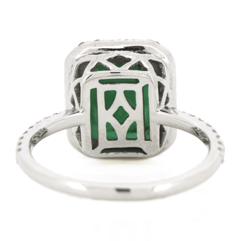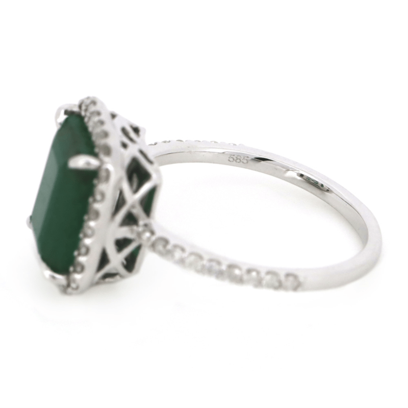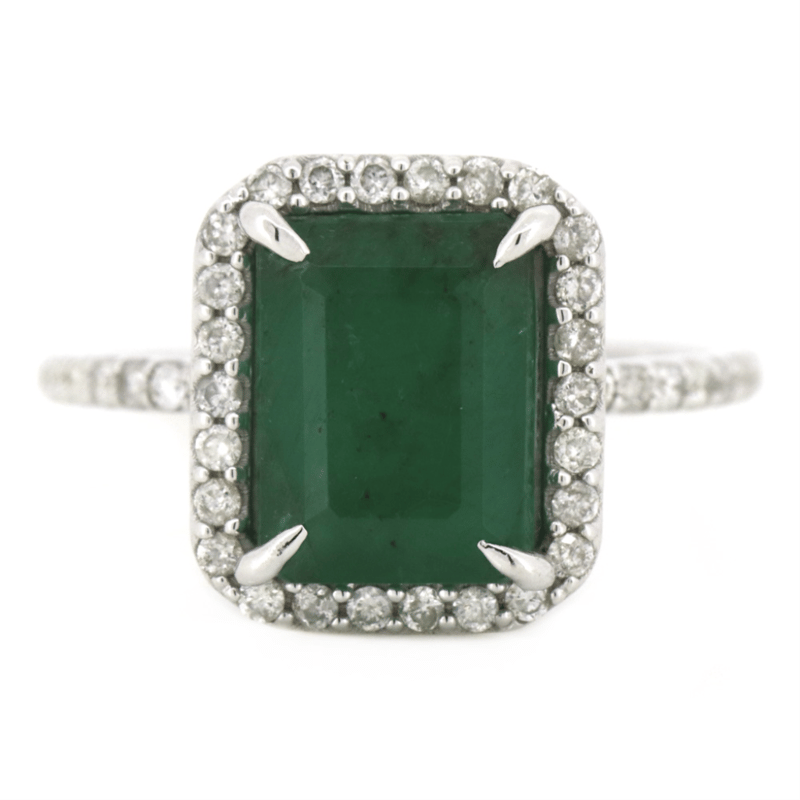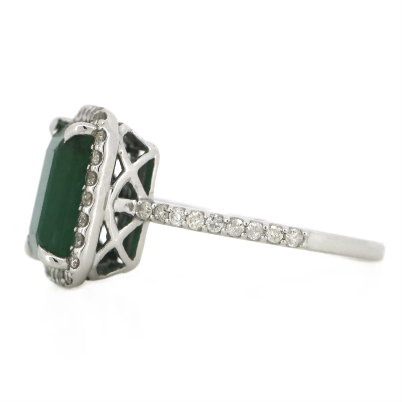 14K WHITE GOLD, EMERALD AND DIAMOND, HALO RING. THE CENTRE FEATURES, ONE RECTANGULAR EMERALD CUT, MEDIUM DARK BLUISH-GREEN, EMERALD (3.47CT, EYE VISIBLE INCLUSIONS), 4 CLAW SET. SURROUNDING THE CENTRE IN A HALO AND DECORATING THE BAND ARE, 44 ROUND BRILLIANT CUT, DIAMONDS (0.40CT TDW, G-H COLOUR, SI2-I2 CLARITY), SHARED CLAW SET. RING SIZE N.
