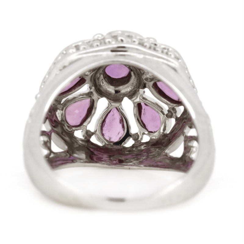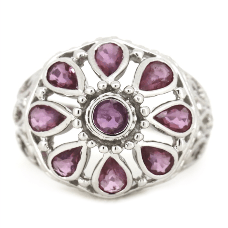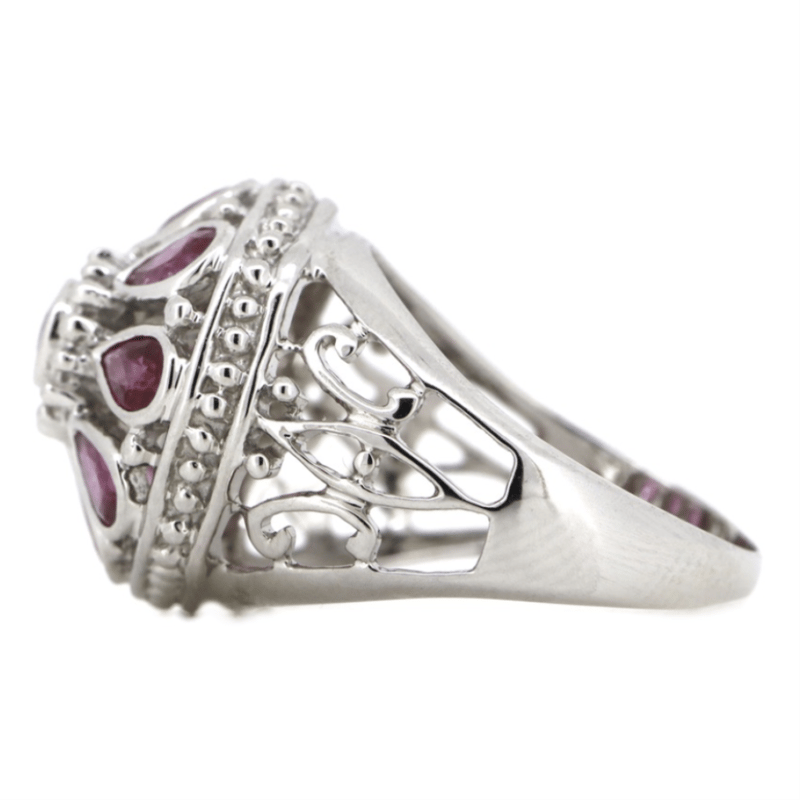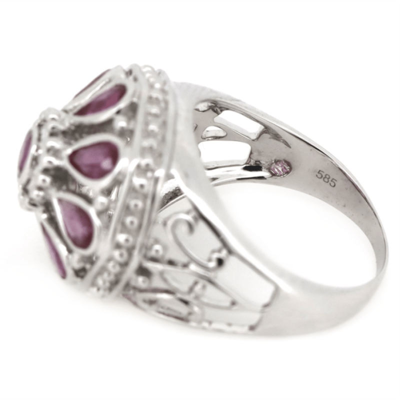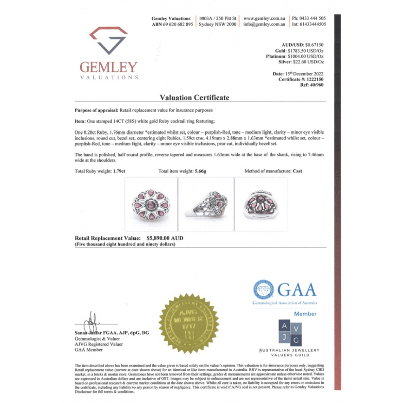 14K WHITE GOLD, RUBY AND DIAMOND, ART DECO INSPIRED RING. THE CENTRE FEATURES, ONE ROUND CUT AND 8 PEAR CUT, LIGHT PURPLISH-RED, RUBIES (1.79CT TSW, MINOR EYE VISIBLE INCLUSIONS), BEZEL SET. RING SIZE J 1/2. Valuations Provided by an Independent Third-Party Professional Not Directly Associated With Lloyds Auctions at AUD $$5,890.00This valuation has been conducted by an independent third-party professional. The valuation amount is an assessment by the issuing valuer and does not reflect the auction value of the item. Any inquiries regarding the valuation should be directed to the issuing valuer (refer to contact details on the certificate), as Lloyds Auctions has no affiliation or influence over the valuation, the valuer, or the stated amount. Condition: Good - Refer Images 0645878+1528