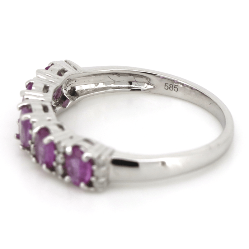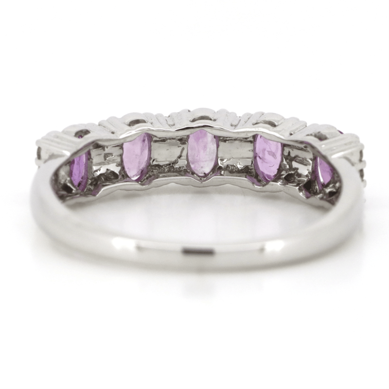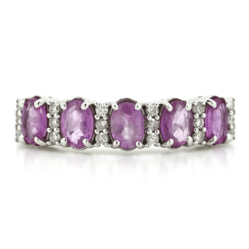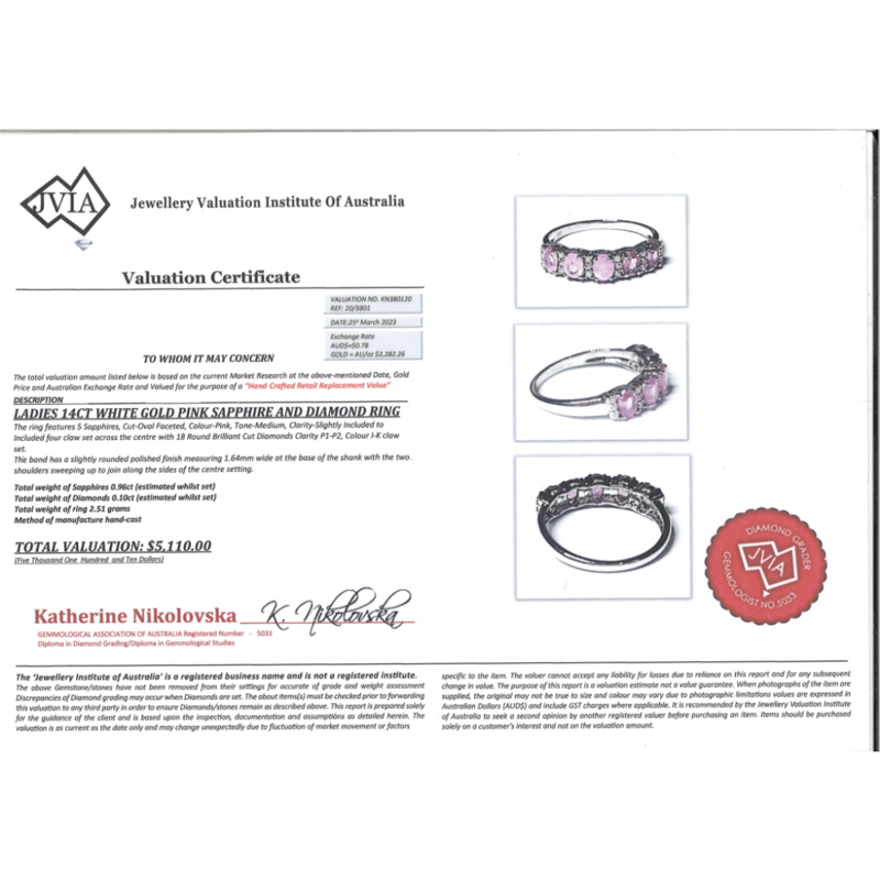 14K WHITE GOLD, PINK SAPPHIRE AND DIAMOND, ETERNITY RING. THE CENTRAL DESIGN FEATURES, 5 OVAL FACETED CUT, MEDIUM PINK, SAPPHIRES (0.96CT TSW, SLIGHTLY INCLUDED-INCLUDED), 4 CLAW SET. ALTERNATING BETWEEN ARE, 18 ROUND BRILLIANT CUT, DIAMONDS (0.10CT TDW, I-K COLOUR, P1-P2 CLARITY), CLAW SET. RING SIZE M. Valuations Provided by an Independent Third-Party Professional Not Directly Associated With Lloyds Auctions at AUD $$5,110.00This valuation has been conducted by an independent third-party professional. The valuation amount is an assessment by the issuing valuer and does not reflect the auction value of the item. Any inquiries regarding the valuation should be directed to the issuing valuer (refer to contact details on the certificate), as Lloyds Auctions has no affiliation or influence over the valuation, the valuer, or the stated amount. Condition: Good - Refer Images 0645878+1534