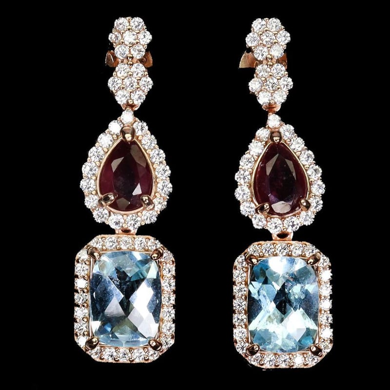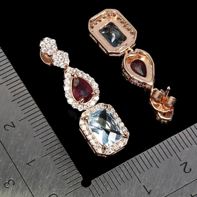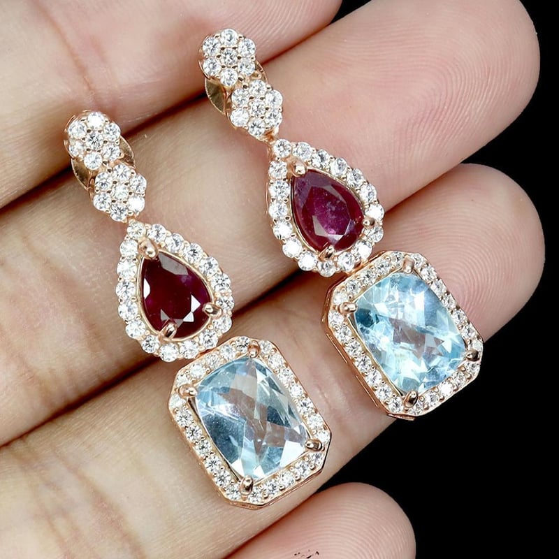 Natural Ruby & Sky Blue Topaz Earrings. Made In Solids Sterling Silver And Plated In14K Rose Gold. Features Natural Blood Red Rubies And Natural Antique Facet Sky Blue Topaz. Earrings Measure 29.0 X 8.0 Mm.