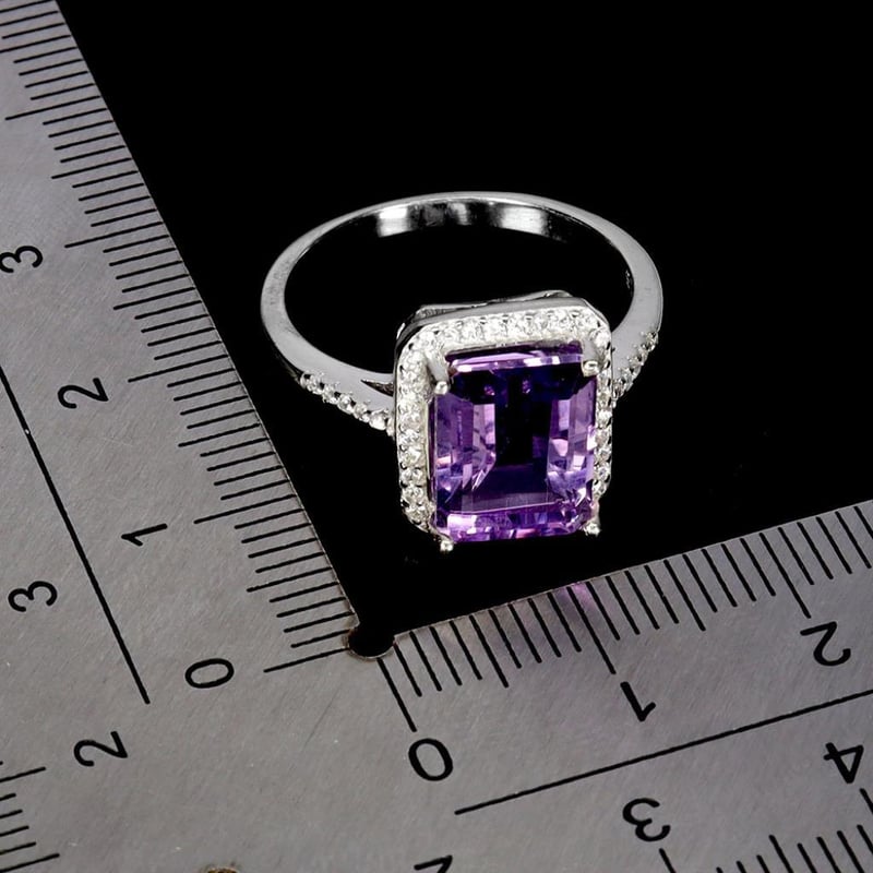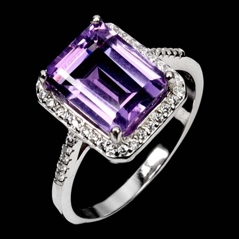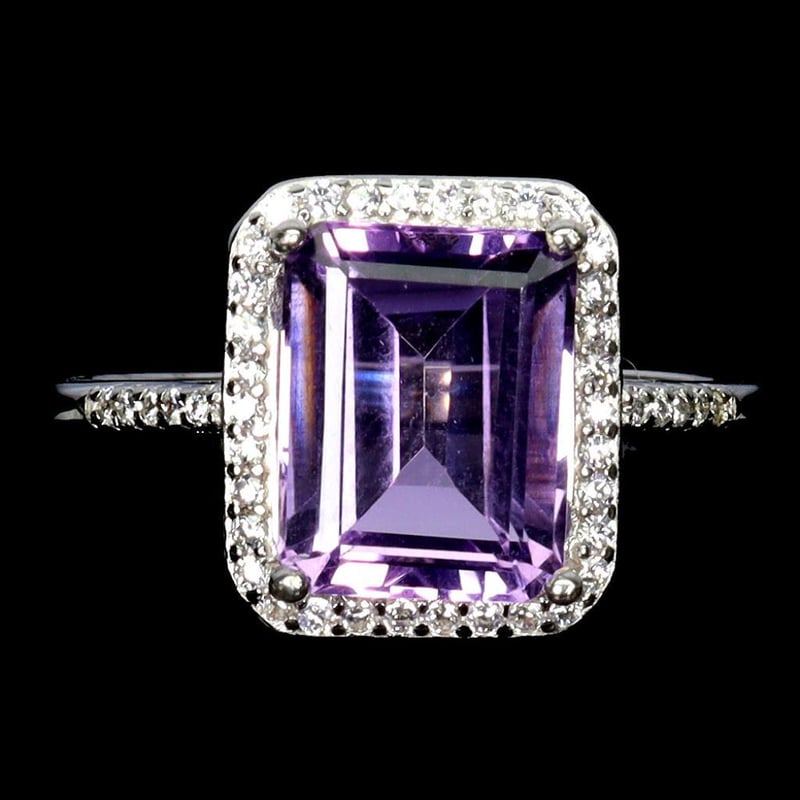 Natural Amethyst Ring. Made In Solid Sterling Silver And Plated In 14K White Gold. Features One Genuine Octagonal Facet Purple Amethyst And Sparkling Czs. Ring Size 8.5