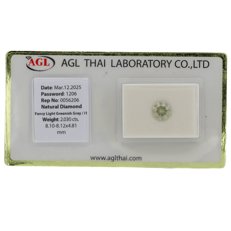 2.03CT CERTIFIED, NATURAL GREEN/GREY DIAMOND, ROUND BRILLIANT CUT, FANCY LIGHT GREENISH-GREY COLOUR, I1 CLARITY, LOOSE, UNSET. STONE COMES SEALED WITH AGL REPORT: 0056206. CONDITION: NEW. Valuations Provided by an Independent Third-Party Professional Not Directly Associated With Lloyds Auctions at AUD $17000This valuation has been conducted by an independent third-party professional. The valuation amount is an assessment by the issuing valuer and does not reflect the auction value of the item. Any inquiries regarding the valuation should be directed to the issuing valuer (refer to contact details on the certificate), as Lloyds Auctions has no affiliation or influence over the valuation, the valuer, or the stated amount. Condition: Good - Refer Images 0+2010