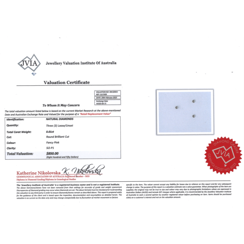 0.01CT TDW X 3, NATURAL FANCY PINK DIAMONDS, ROUND BRILLIANT CUT, FANCY PINK, SI2-P1 CLARITY, LOOSE, UNSET. Valuations Provided by an Independent Third-Party Professional Not Directly Associated With Lloyds Auctions at AUD $850This valuation has been conducted by an independent third-party professional. The valuation amount is an assessment by the issuing valuer and does not reflect the auction value of the item. Any inquiries regarding the valuation should be directed to the issuing valuer (refer to contact details on the certificate), as Lloyds Auctions has no affiliation or influence over the valuation, the valuer, or the stated amount. Condition: Good - Refer Images 0+2091
