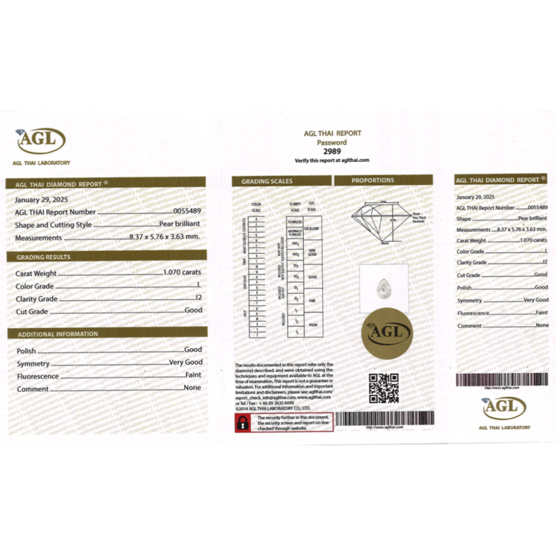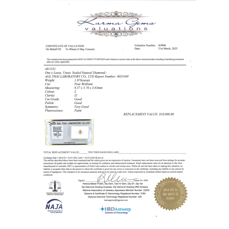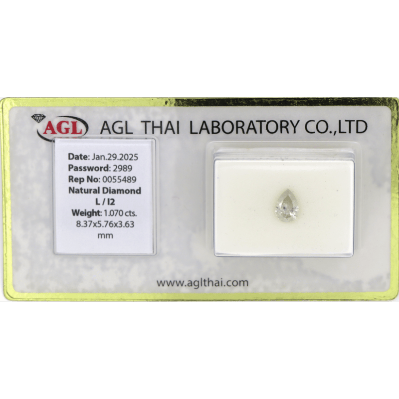 1.571CT CERTIFIED, NATURAL DIAMOND, PEAR BRILLIANT CUT, L COLOUR, I2 CLARITY, LOOSE, UNSET. STONE COMES SEALED WITH AGL REPORT: 0055489. Valuations Provided by an Independent Third-Party Professional Not Directly Associated With Lloyds Auctions at AUD $10000This valuation has been conducted by an independent third-party professional. The valuation amount is an assessment by the issuing valuer and does not reflect the auction value of the item. Any inquiries regarding the valuation should be directed to the issuing valuer (refer to contact details on the certificate), as Lloyds Auctions has no affiliation or influence over the valuation, the valuer, or the stated amount. Condition: Good - Refer Images 0+2041