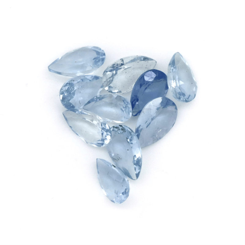 5.96CT TSW X 10, NATURAL BERYL AQUAMARINES, PEAR FACETED CUT, MEDIUM LIGHT-DEEP BLUE, MINOR INCLUSIONS-SLIGHTLY INCLUDED, LOOSE, UNSET.