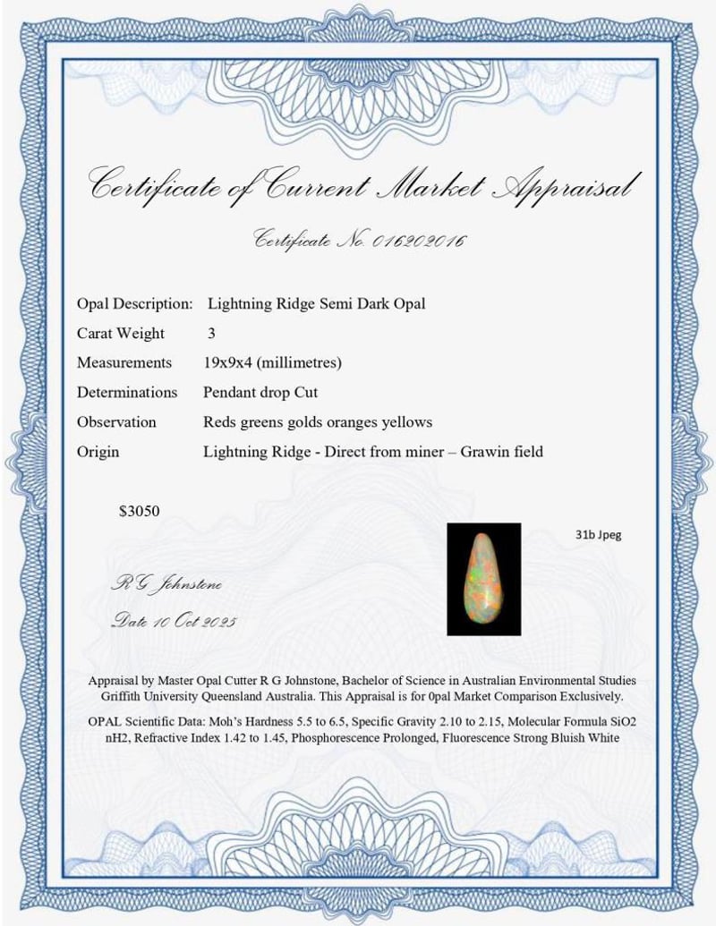 3 CARATS LIGHTNING RIDGE SEMI DARK OPAL. BRIGHT AND DENSE COLOUR AND SATURATION. 19X9X4