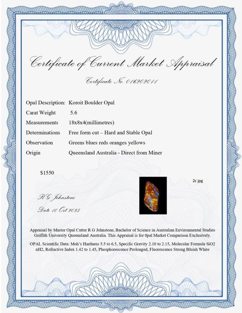 5.6 CARATS KOROIT BOULDER OPAL. NICE FREE FORM STONE WITH HARD AND STABLE OPAL , WELL FINISHED WITH BRIGHT SPRAYS OF COLOUR.18X8X4 Valuations Provided by an Independent Third-Party Professional Not Directly Associated With Lloyds Auctions at AUD $1550This valuation has been conducted by an independent third-party professional. The valuation amount is an assessment by the issuing valuer and does not reflect the auction value of the item. Any inquiries regarding the valuation should be directed to the issuing valuer (refer to contact details on the certificate), as Lloyds Auctions has no affiliation or influence over the valuation, the valuer, or the stated amount. Condition: Good - Refer Images 0586205+2