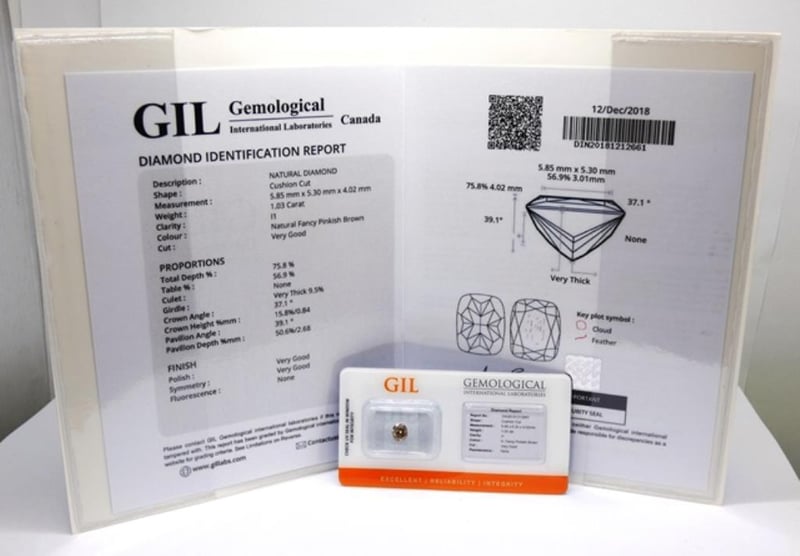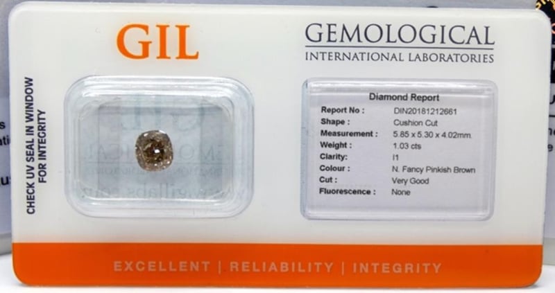 1.03CT DIAMOND Cushion Cut, Natural Fancy Pinkish Brown In Colour, I1 In Clarity, 5.85 X 5.30 X 4.02Mm Dimensions, Loose, Unset. Comes In Sealed Packet With Gil Report: Din20181212661 Jewellery Valuations Provided By A Third Party Professional Not Directly Associated With Lloyds Auctions at AUD $16950 This Insurance Valuation has been provided by a registered Jewellery Valuer and is intended for insurance purposes only. The valuation amount has no bearing on the auction value of the item. Any questions regarding the valuation should be directed to the issuing Valuer (refer to contact details on the certificate) as Lloyds have no association or relationship with the Valuer or the valuation amount contained within the valuation. 0 584860+8