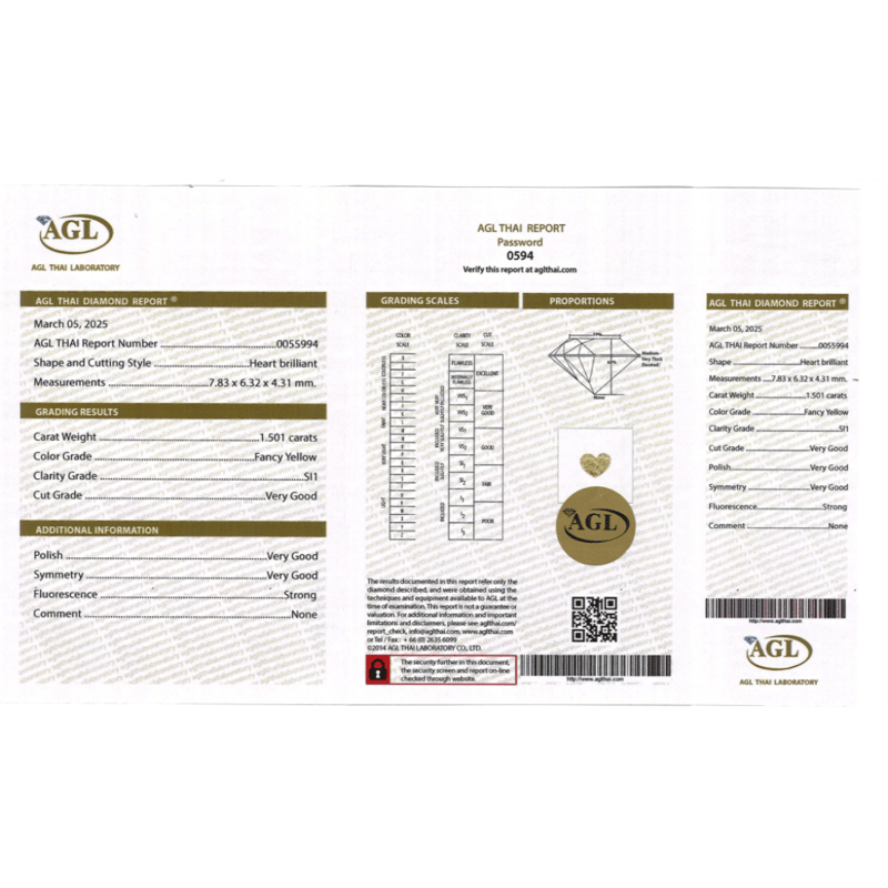 1.501CT CERTIFIED, NATURAL FANCY YELLOW DIAMOND, HEART BRILLIANT CUT, FANCY YELLOW, SI1 CLARITY, LOOSE, UNSET. STONE COMES SEALED WITH AGL REPORT: 0055994. Valuations Provided by an Independent Third-Party Professional Not Directly Associated With Lloyds Auctions at AUD $20000This valuation has been conducted by an independent third-party professional. The valuation amount is an assessment by the issuing valuer and does not reflect the auction value of the item. Any inquiries regarding the valuation should be directed to the issuing valuer (refer to contact details on the certificate), as Lloyds Auctions has no affiliation or influence over the valuation, the valuer, or the stated amount. Condition: Good - Refer Images 0645872+2117