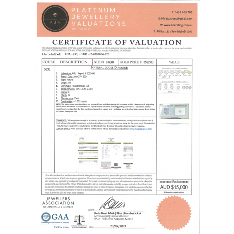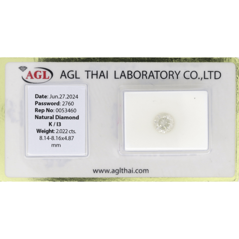 2.022CT CERTIFIED, NATURAL DIAMOND, ROUND BRILLIANT CUT, K COLOUR, I3 CLARITY, LOOSE, UNSET. STONE COMES SEALED WITH AGL REPORT: 0053460.
