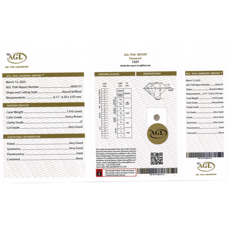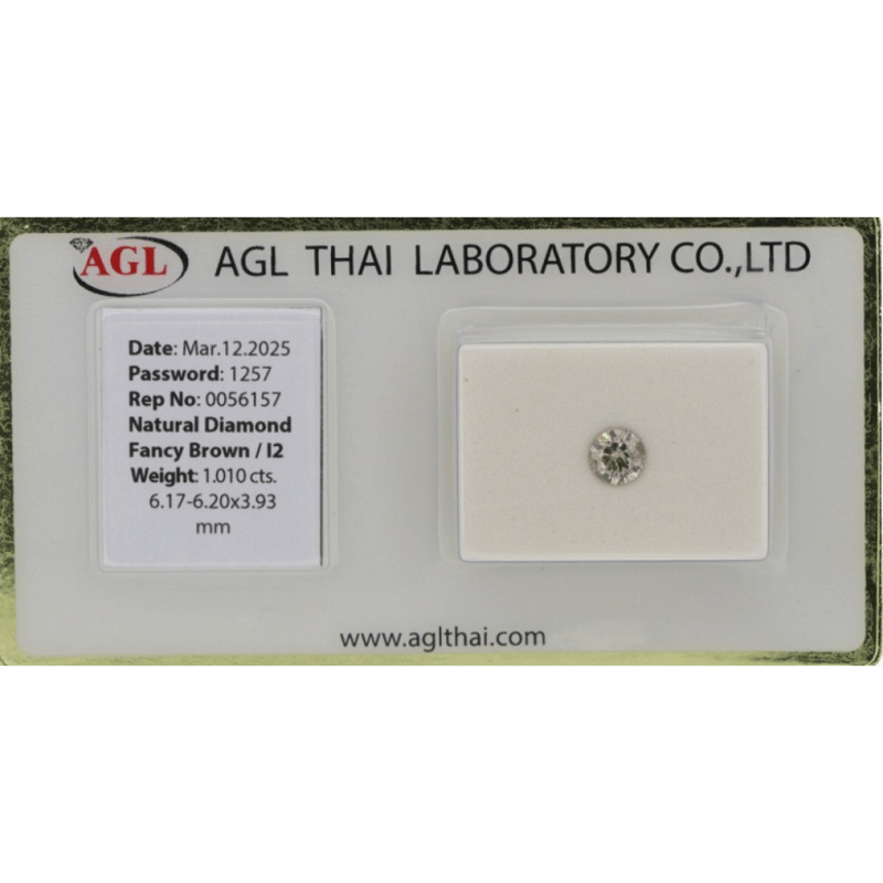 1.010CT CERTIFIED, NATURAL FANCY BROWN DIAMOND, ROUND BRILLIANT CUT, FANCY BROWN, I2 CLARITY, LOOSE, UNSET. STONE COMES SEALED WITH AGL REPORT: 0056157. Valuations Provided by an Independent Third-Party Professional Not Directly Associated With Lloyds Auctions at AUD $22000This valuation has been conducted by an independent third-party professional. The valuation amount is an assessment by the issuing valuer and does not reflect the auction value of the item. Any inquiries regarding the valuation should be directed to the issuing valuer (refer to contact details on the certificate), as Lloyds Auctions has no affiliation or influence over the valuation, the valuer, or the stated amount. Condition: Good - Refer Images 0645872+2173