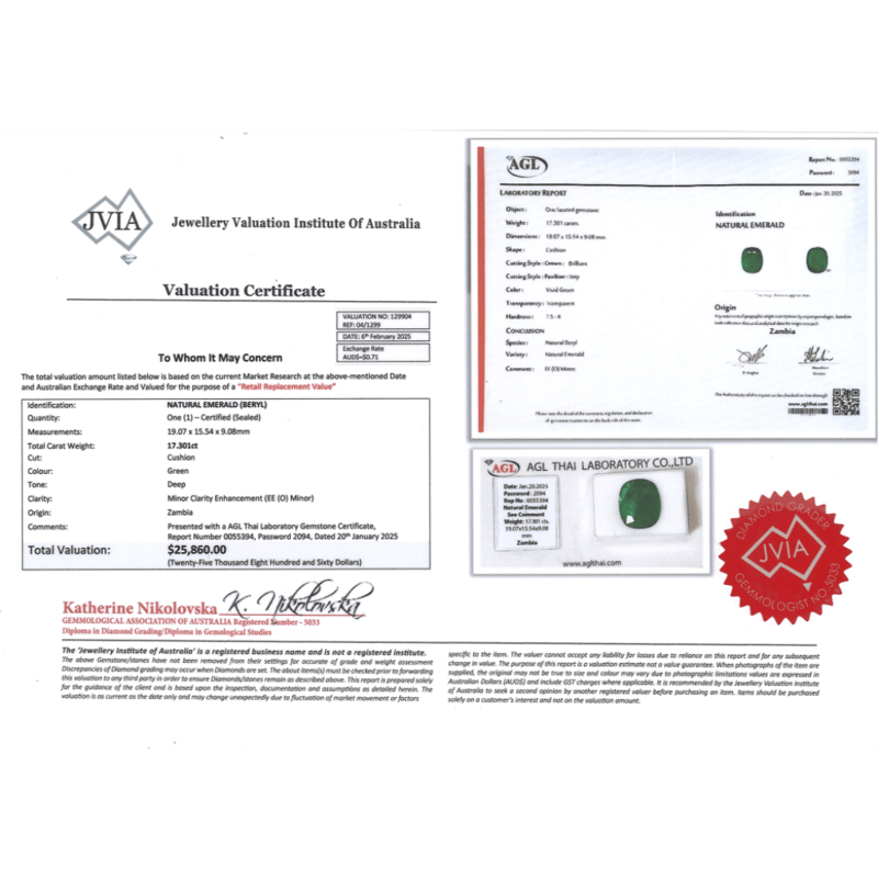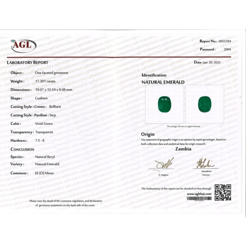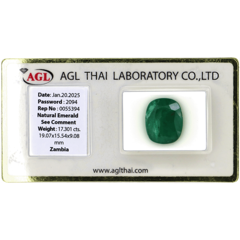 17.301CT CERTIFIED, NATURAL EMERALD, CUSHION BRILLIANT CUT, VIVID GREEN, INCLUDED, ORIGIN ZAMBIA, LOOSE, UNSET. STONE COMES SEALED WITH AGL REPORT: 0055394. Valuations Provided by an Independent Third-Party Professional Not Directly Associated With Lloyds Auctions at AUD $25860This valuation has been conducted by an independent third-party professional. The valuation amount is an assessment by the issuing valuer and does not reflect the auction value of the item. Any inquiries regarding the valuation should be directed to the issuing valuer (refer to contact details on the certificate), as Lloyds Auctions has no affiliation or influence over the valuation, the valuer, or the stated amount. Condition: Good - Refer Images 0645872+2113