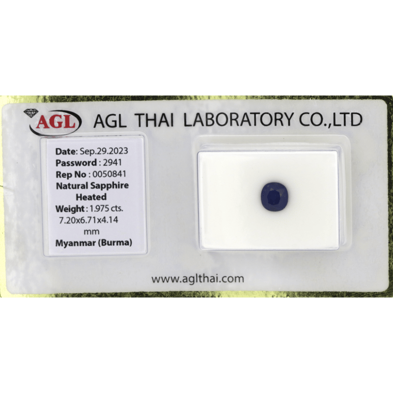 1.975CT CERTIFIED, NATURAL BLUE BURMESE SAPPHIRE, CUSHION CUT, MEDIUM DARK BLUE, MODERATE EYE VISIBLE INCLUSIONS, HEAT ENHANCED, BURMESE ORIGIN, LOOSE, UNSET. STONE COMES SEALED WITH AGL REPORT: 0050841. Valuations Provided by an Independent Third-Party Professional Not Directly Associated With Lloyds Auctions at AUD $3190This valuation has been conducted by an independent third-party professional. The valuation amount is an assessment by the issuing valuer and does not reflect the auction value of the item. Any inquiries regarding the valuation should be directed to the issuing valuer (refer to contact details on the certificate), as Lloyds Auctions has no affiliation or influence over the valuation, the valuer, or the stated amount. Condition: Good - Refer Images 0645872+2183