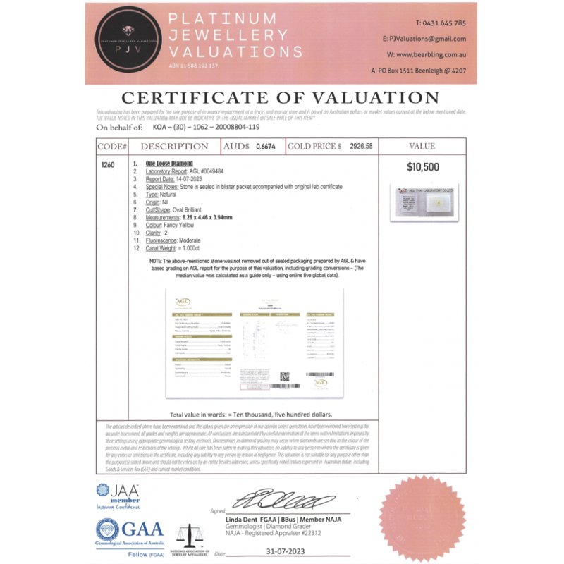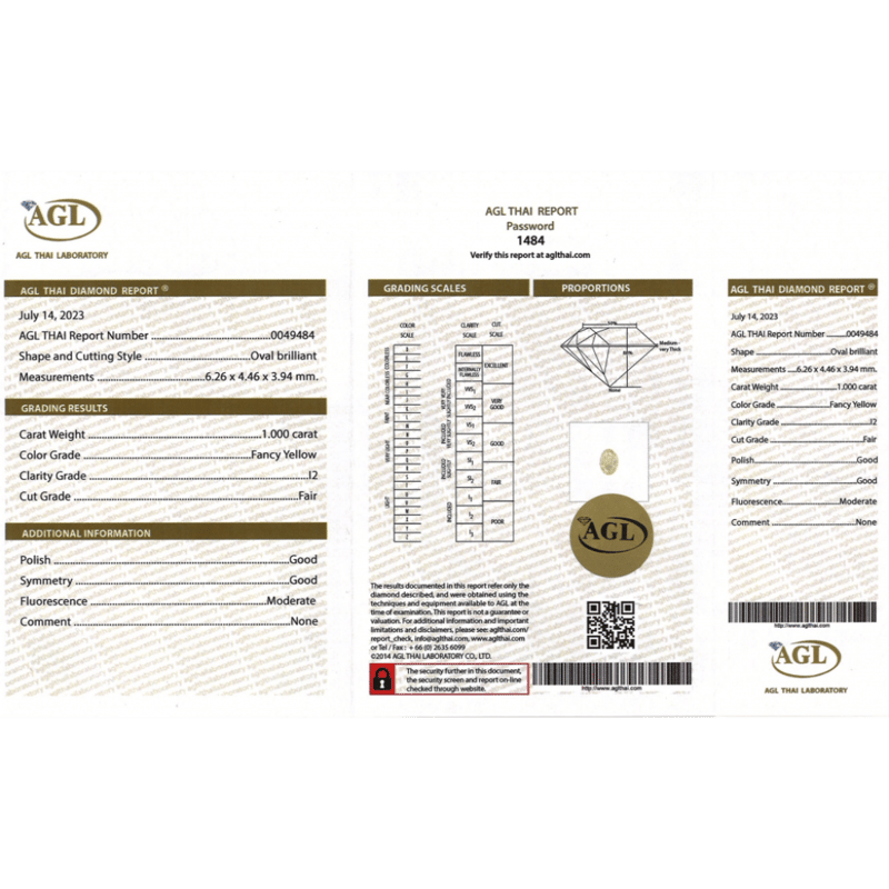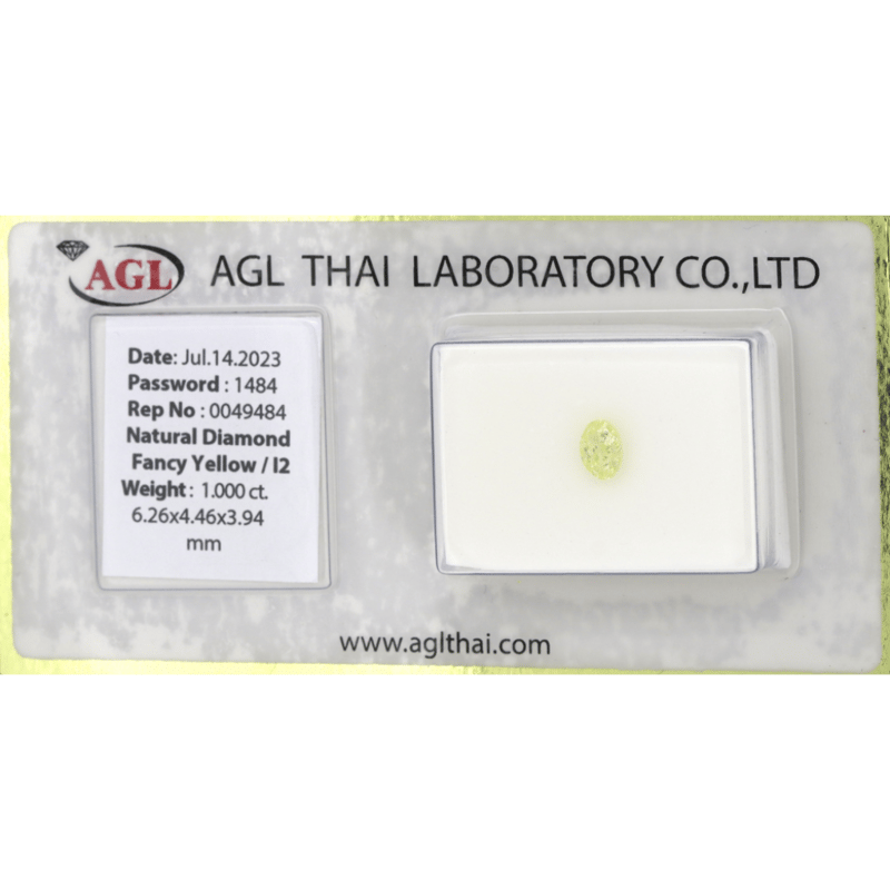 1.00CT CERTIFIED, NATURAL FANCY YELLOW DIAMOND, OVAL BRILLIANT CUT, FANCY YELLOW, I2 CLARITY, LOOSE, UNSET. STONE COMES SEALED WITH AGL REPORT: 0049484.
