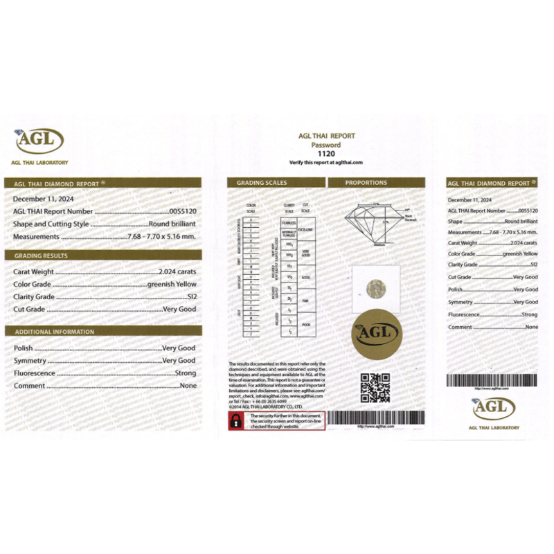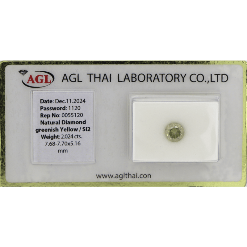 2.24CT CERTIFIED, NATURAL GREEN/YELLOW DIAMOND, ROUND BRILLIANT CUT, GREENISH-YELLOW, SI2 CLARITY, LOOSE, UNSET. STONE COMES SEALED WITH AGL REPORT: 0055120. Valuations Provided by an Independent Third-Party Professional Not Directly Associated With Lloyds Auctions at AUD $15600This valuation has been conducted by an independent third-party professional. The valuation amount is an assessment by the issuing valuer and does not reflect the auction value of the item. Any inquiries regarding the valuation should be directed to the issuing valuer (refer to contact details on the certificate), as Lloyds Auctions has no affiliation or influence over the valuation, the valuer, or the stated amount. Condition: Good - Refer Images 0645872+2157