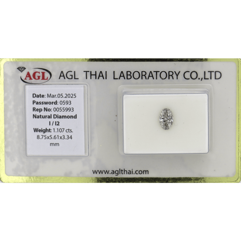 1.107CT CERTIFIED, NATURAL DIAMOND, OVAL BRILLIANT CUT, I COLOUR, I2 CLARITY, LOOSE, UNSET. STONE COMES SEALED WITH AGL REPORT: 0055993.