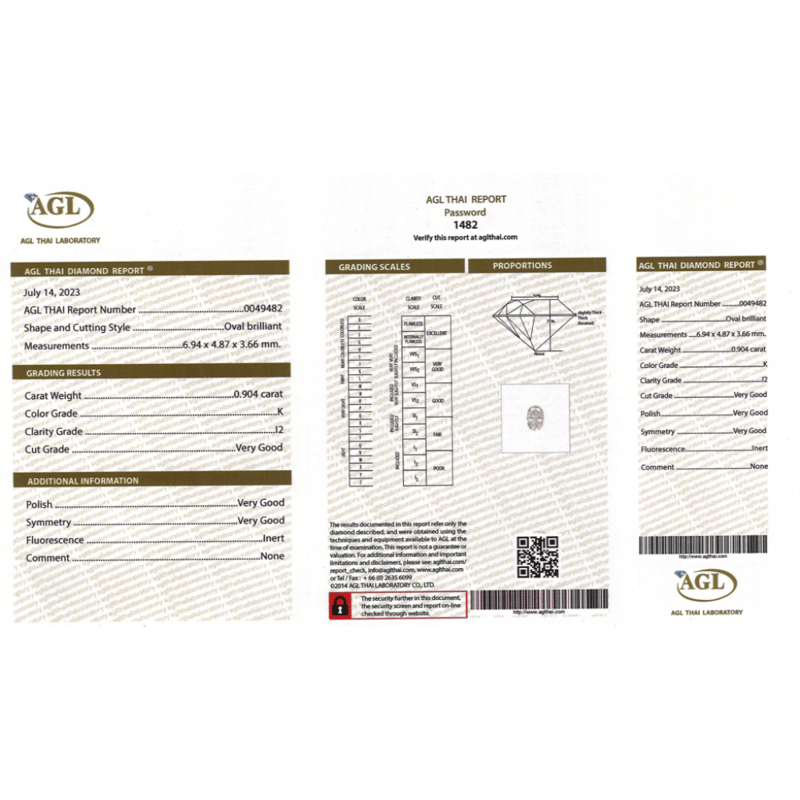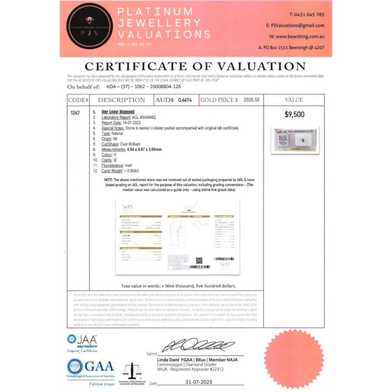 0.904CT CERTIFIED, NATURAL DIAMOND, OVAL BRILLIANT CUT, K COLOUR, I2 CLARITY, LOOSE, UNSET. THE STONE COMES SEALED WITH AGL REPORT: 0049482. Valuations Provided by an Independent Third-Party Professional Not Directly Associated With Lloyds Auctions at AUD $9500This valuation has been conducted by an independent third-party professional. The valuation amount is an assessment by the issuing valuer and does not reflect the auction value of the item. Any inquiries regarding the valuation should be directed to the issuing valuer (refer to contact details on the certificate), as Lloyds Auctions has no affiliation or influence over the valuation, the valuer, or the stated amount. Condition: Good - Refer Images 0645872+2131