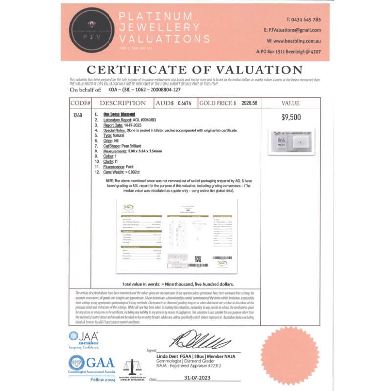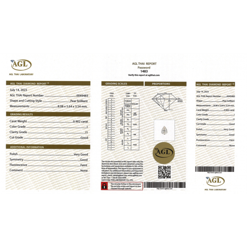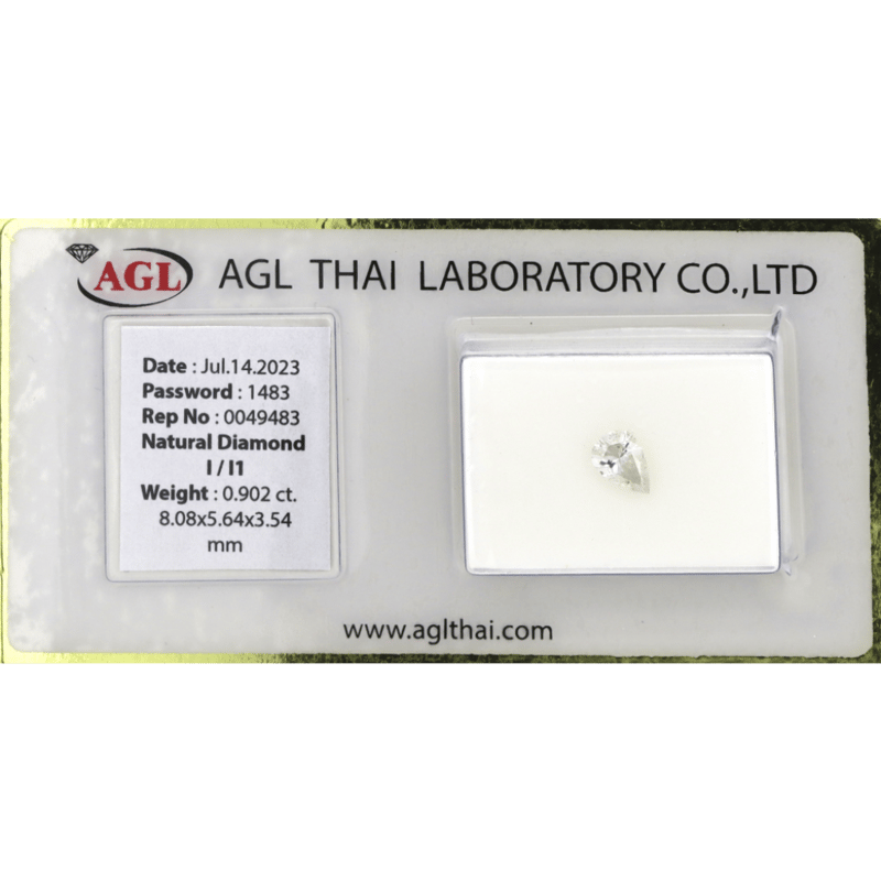 0.902CT CERTIFIED, NATURAL DIAMOND, PEAR BRILLIANT CUT, I COLOUR, I1 CLARITY, LOOSE, UNSET. STONE COMES SEALED WITH AGL REPORT: 0049483.