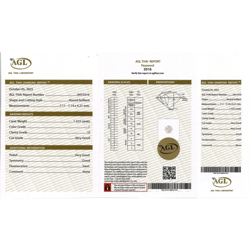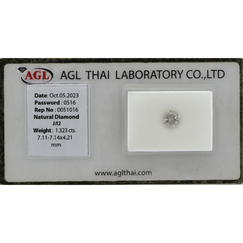 1.323CT CERTIFIED, NATURAL DIAMOND, ROUND BRILLIANT CUT, J COLOUR, I2 CLARITY, LOOSE, UNSET. STONE COMES SEALED WITH AGL REPORT: 0051016.